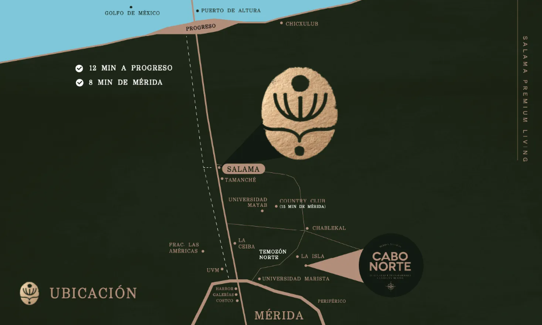 The location of Salama is exceptional, situated on the Mérida-Progreso highway, the most important road in all of Yucatán, just 12 kilometers from the Mérida ring road and 13 kilometers from the entrance to Progreso, the main port of the state with a huge beach, in addition to high-level infrastructure and development.