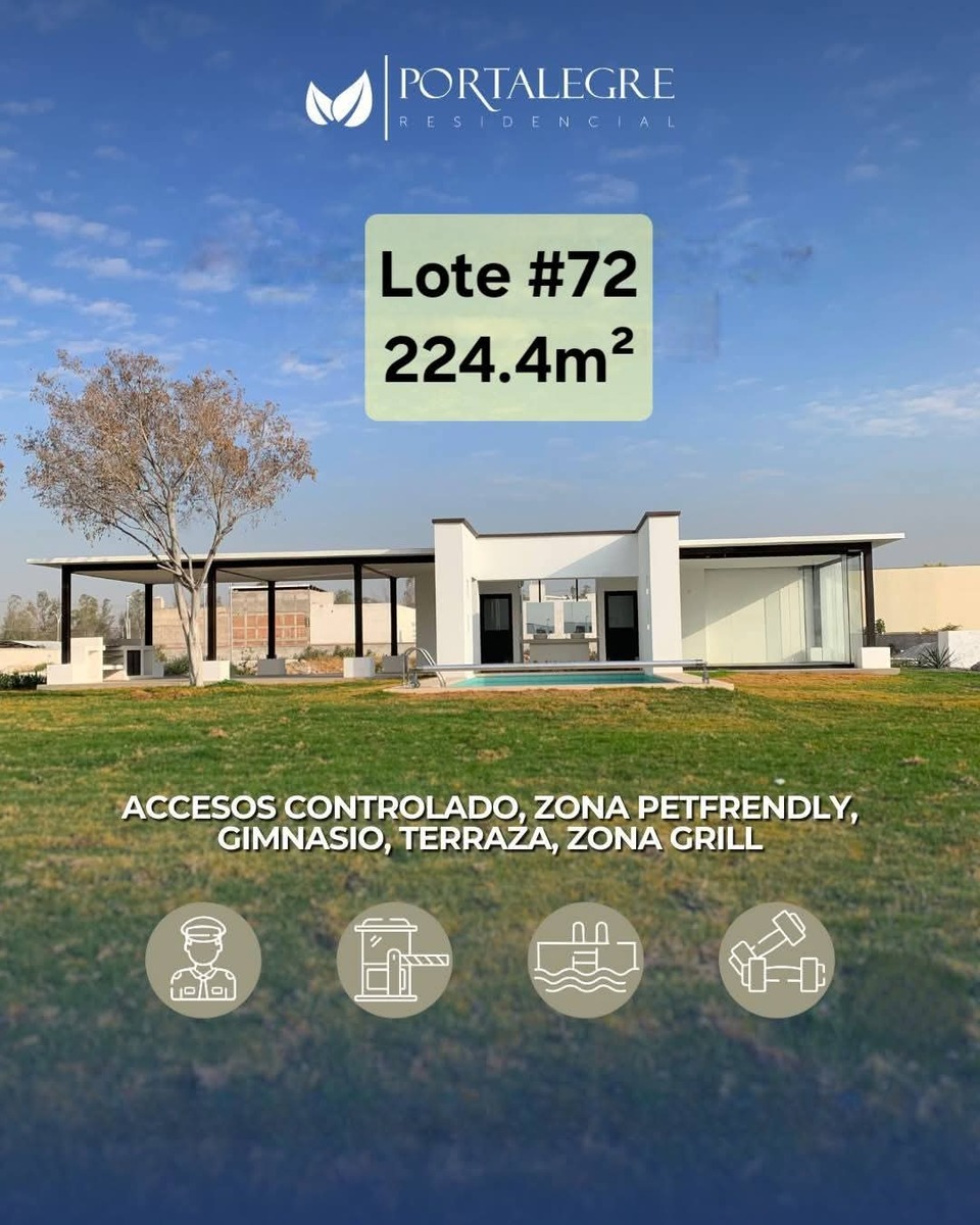 Se vende terreno en Provincia Santa Elena, Condominio Portalegre, zona campo militar, únicamente a 2 km del centro de Querétaro.el fraccionamiento cuenta con seguridad 24/7 y diversas amenidades como alberca, gimnasio con cardio, terraza con asador, áreas verdes pet friendly.