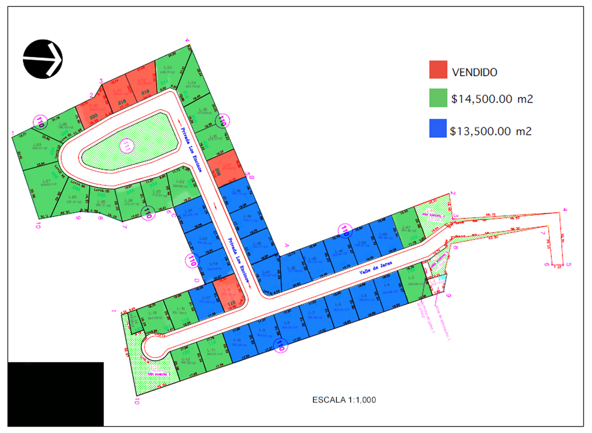 • Fraccionamiento privado con 43 lotes habitacionales, lotes desde ≈ 330 m²; disponibles con diferentes frentes y fondos según ubicación dentro del desarrollo.