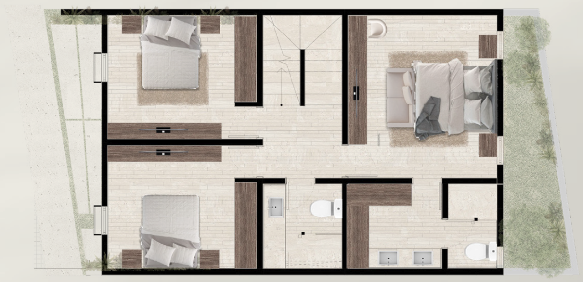 * This is a render that may vary from the actual result.*Exclusivos y cómodos town houses de 3 habitaciones, en un complejo residencial de 8 unidades.