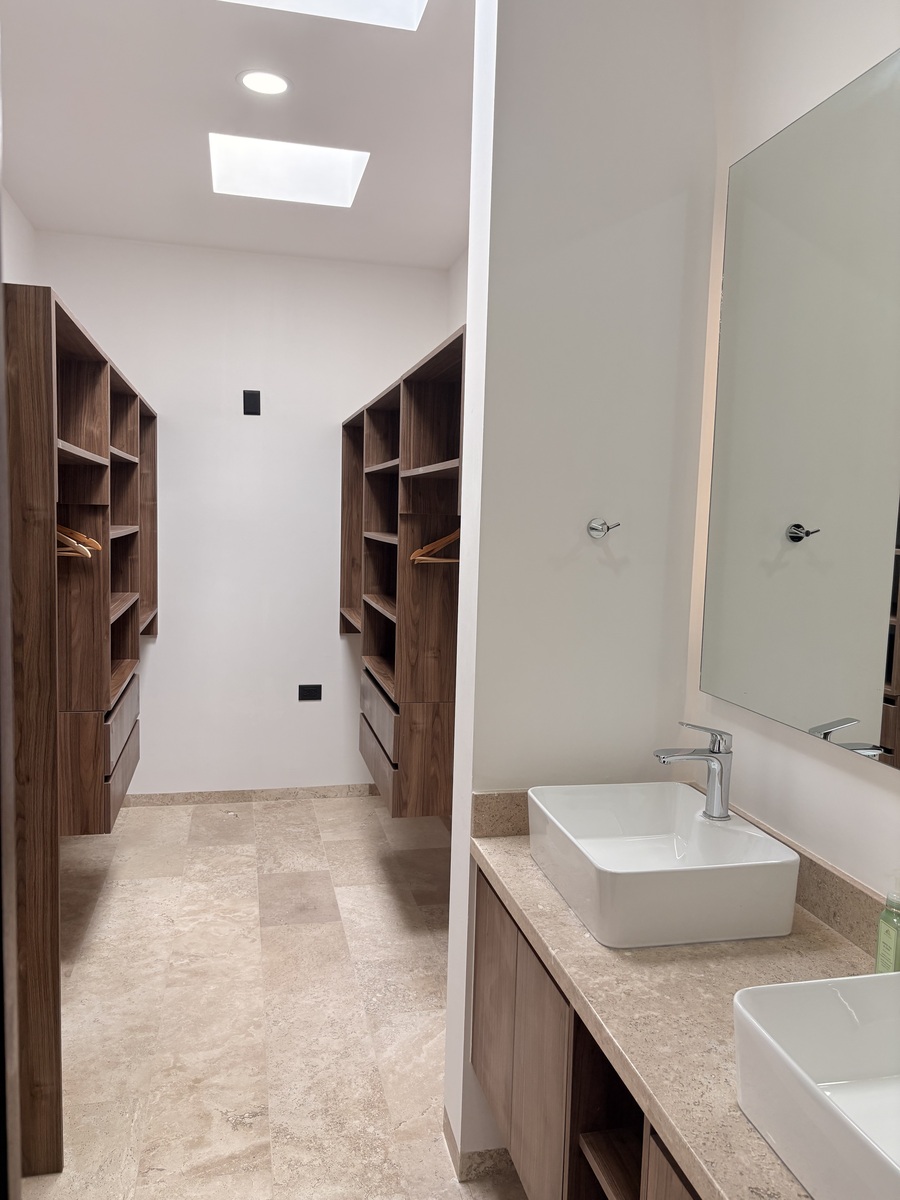 Mesetas de mármol en baños con mueble de madera MDP Hidrófugo