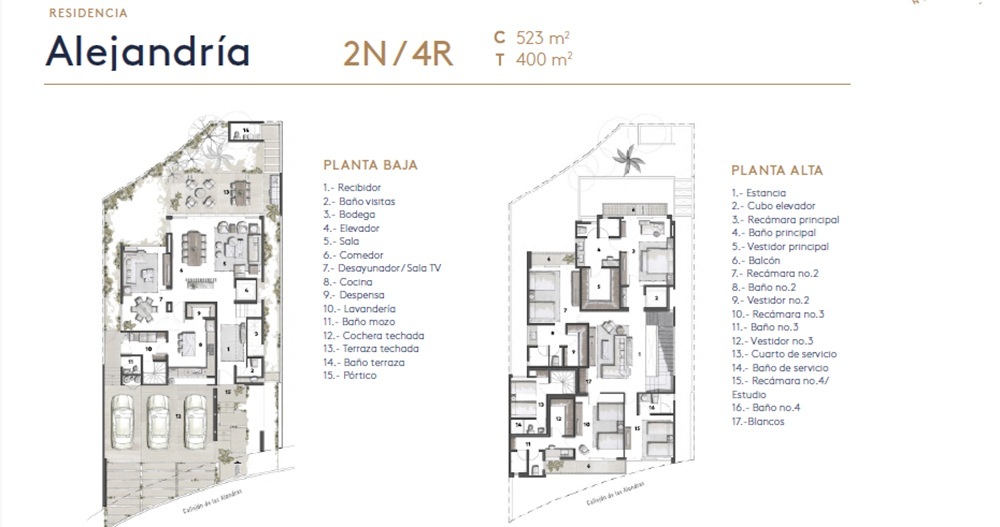 PLANTA BAJA: Recibidor, Cocina, Despensa, Desayunador / Sala TV, Comedor, Sala, Baño visitas, Cubo elevador, Biblioteca / Sala TV, Lavandería, Patio de servicio, Terraza con baño, Jardín, Pórtico