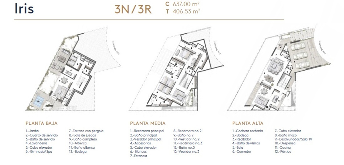 PLANTA BAJA: Jardín, Cuarto de servicio con baño, Lavandería, Cubo elevador, Gimnasio/Spa, Terraza con pérgola, Sala de juegos, Baño completo, Alberca con baño,