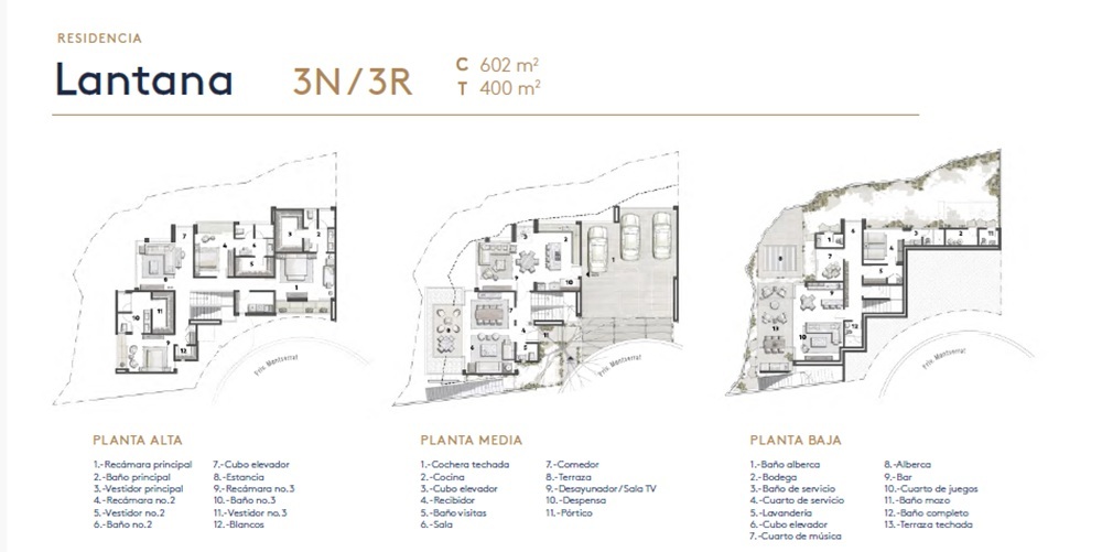 PLANTA BAJA: Alberca con baño, Terraza techada, Lavandería, Cubo elevador, Cuarto de música, Cuarto de servicio con baño, Bodega, Baño de mozo, Baño completo.