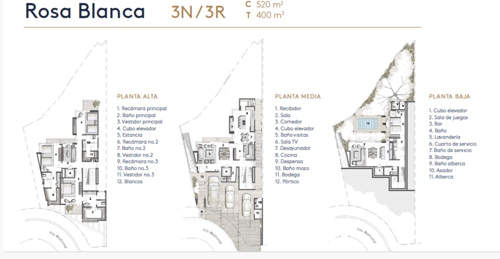 PLANTA BAJA: Cochera para 3 autos techada + 1 en rampa sin techar, Cubo elevador, Sala de juegos, Bar, Lavandería, Cuarto de servicio con baño, Alberca con asador y baño, bodega