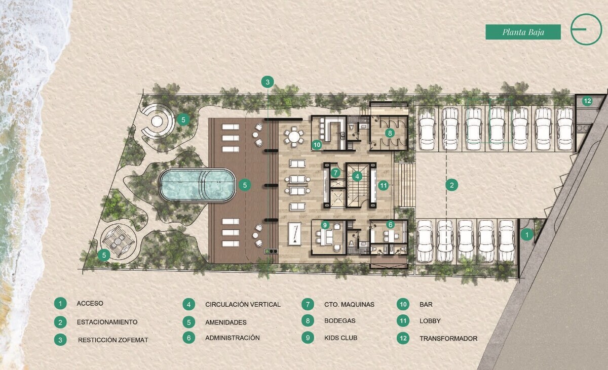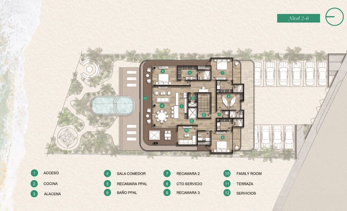 Se compone de ocho niveles, incluído un Sky Lounge. Seis niveles destinados a 6 departamentos de plantas completas, todas con vista al mar y acabados que armonizan con la limpieza y pulcritud del diseño.
