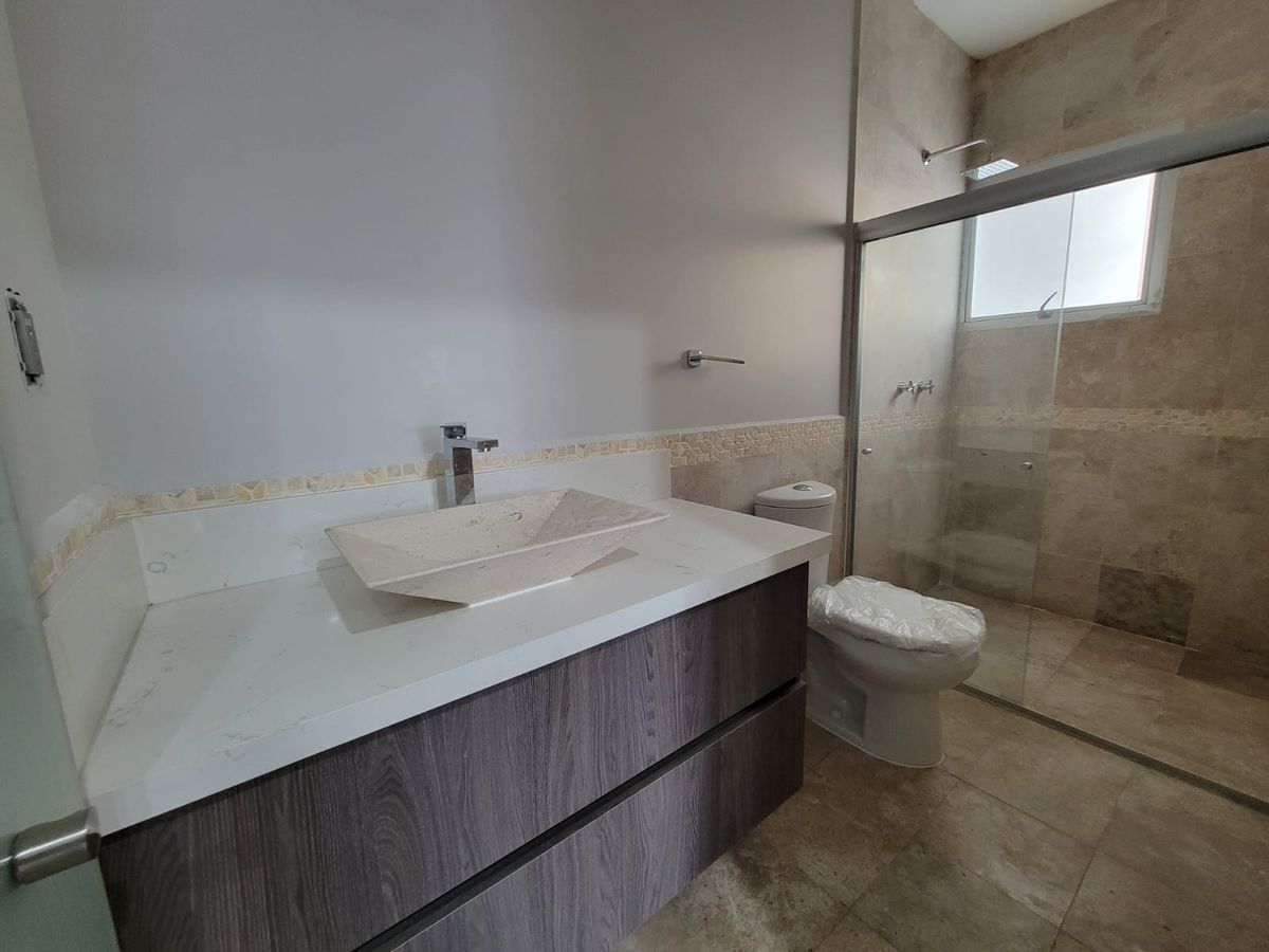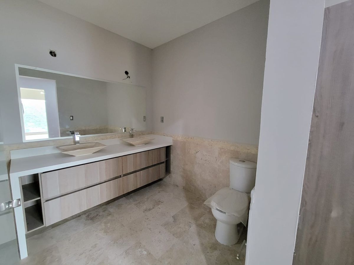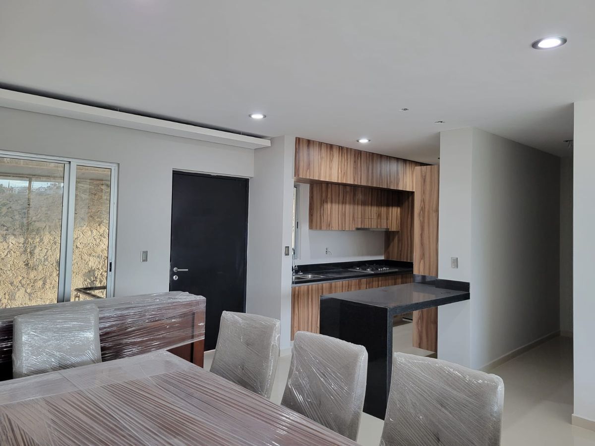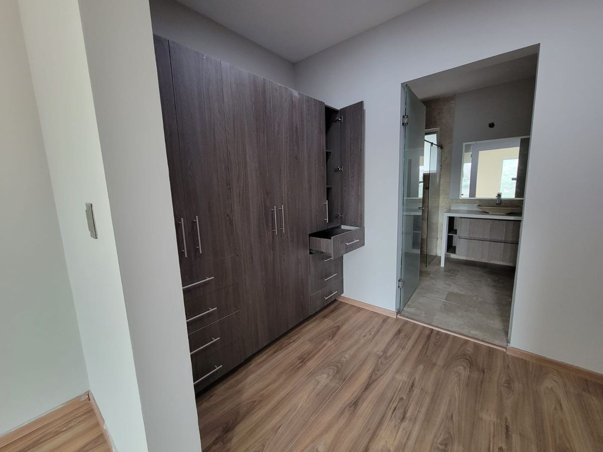 Las recámaras principal y secundaria cuentan con vestidor y baño completo, además de un tercer espacio que puede ser utilizado como recámara o estudio. Cocina equipada con barra de granito, amplio espacio para sala y comedor, terraza con muy bonita vista. Cuarto de servicio.