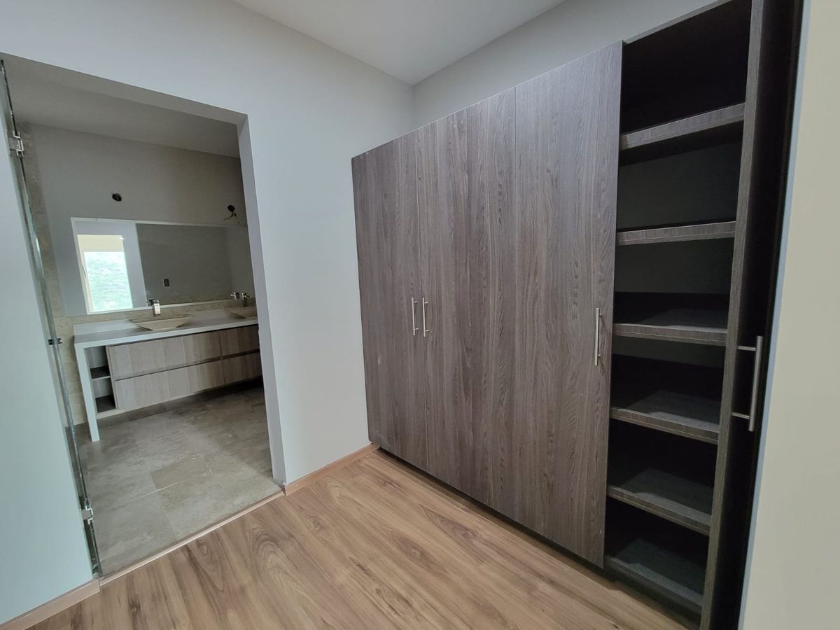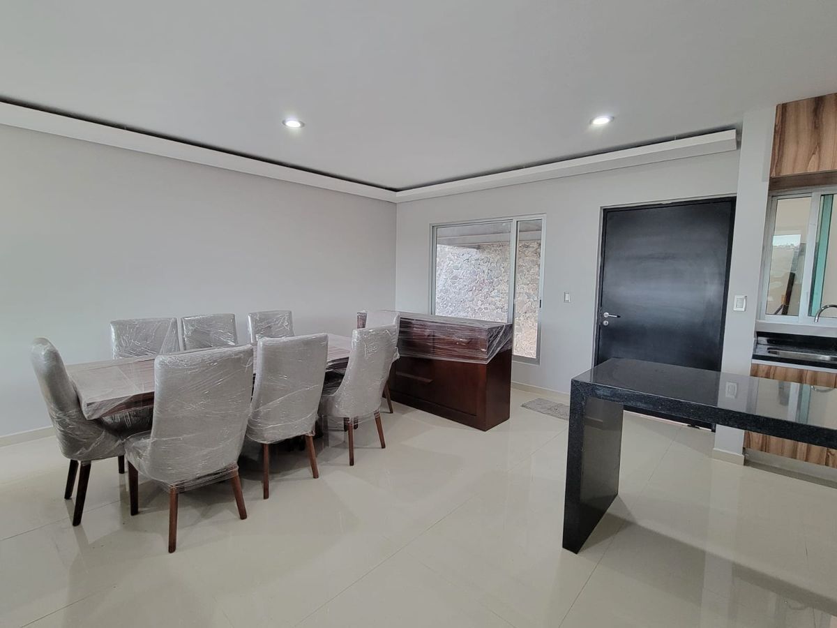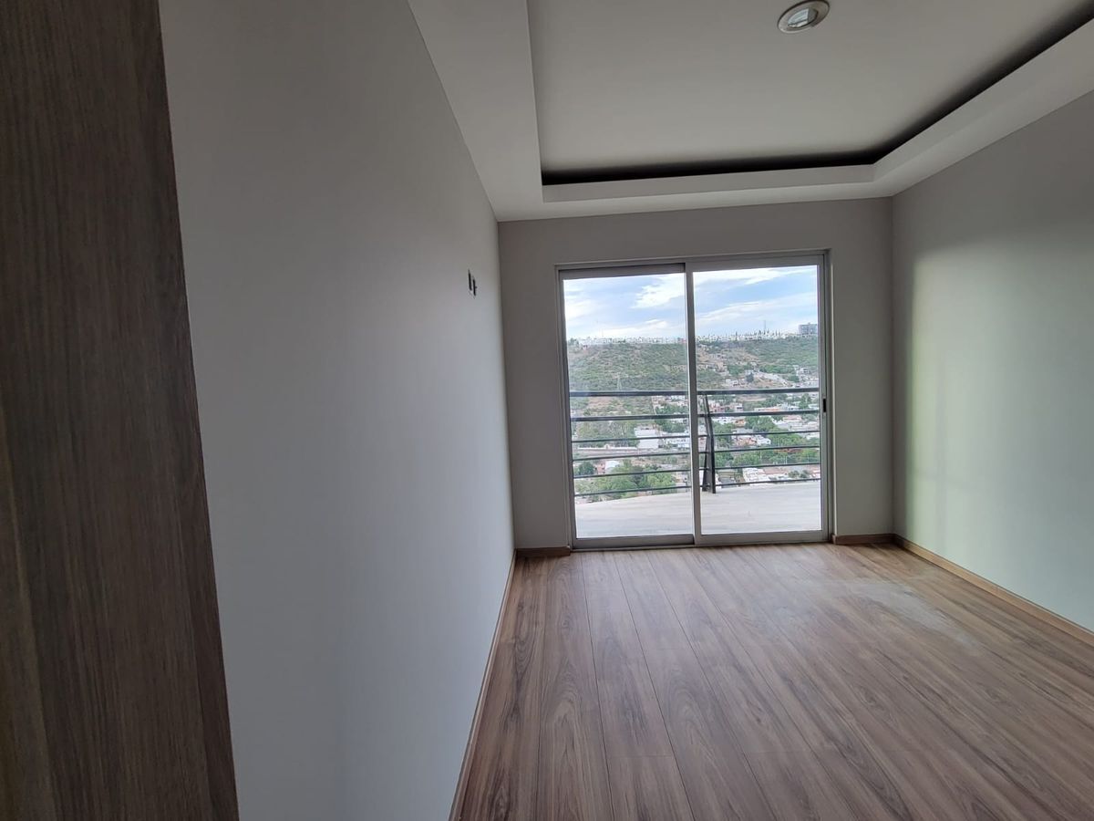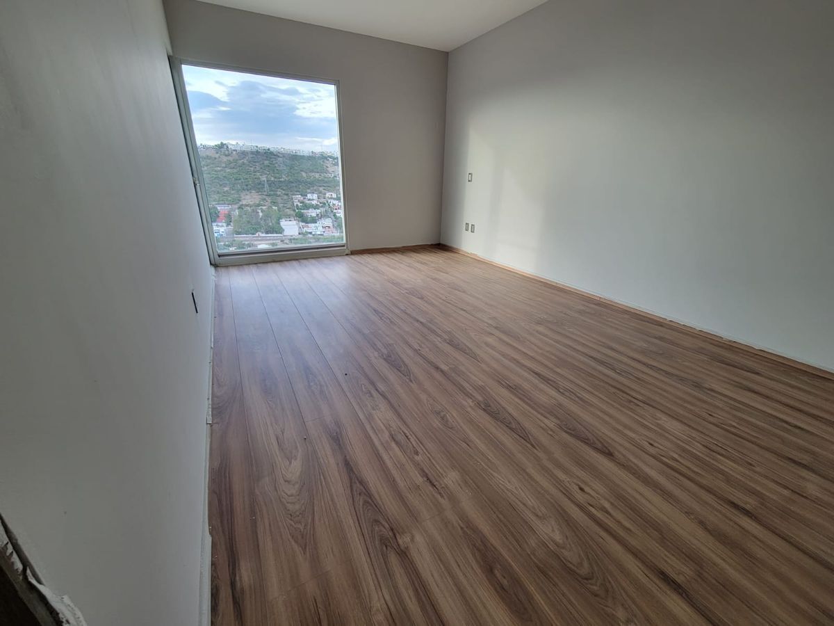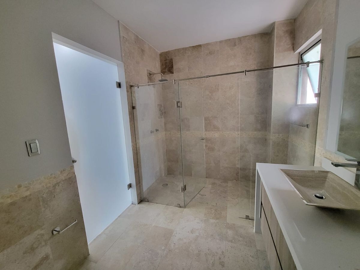 Las recámaras principal y secundaria cuentan con vestidor y baño completo, además de un tercer espacio que puede ser utilizado como recámara o estudio. Cocina equipada con barra de granito, amplio espacio para sala y comedor, terraza con muy bonita vista. Cuarto de servicio.