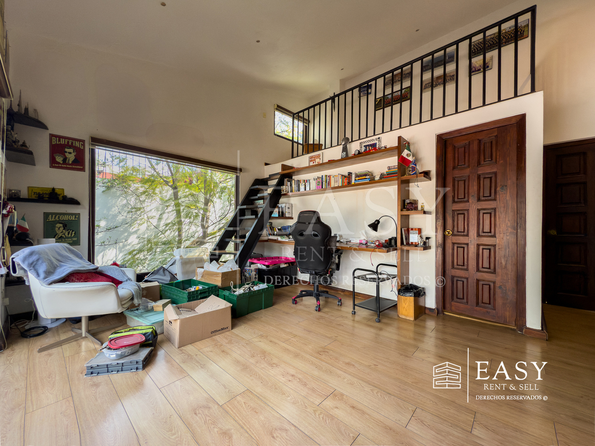 El jardín rodea la propiedad, proporcionando un ambiente fresco y natural. Al fondo se encuentra un acogedor loft independiente con una habitación, baño completo y una pequeña cocina, ideal para visitas o como espacio multifuncional."
