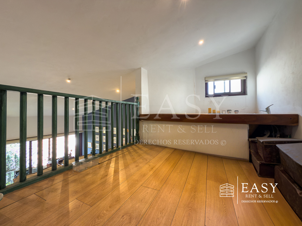 The garden surrounds the property, providing a fresh and natural environment. At the back, there is a cozy independent loft with a bedroom, full bathroom, and a small kitchen, ideal for guests or as a multifunctional space."