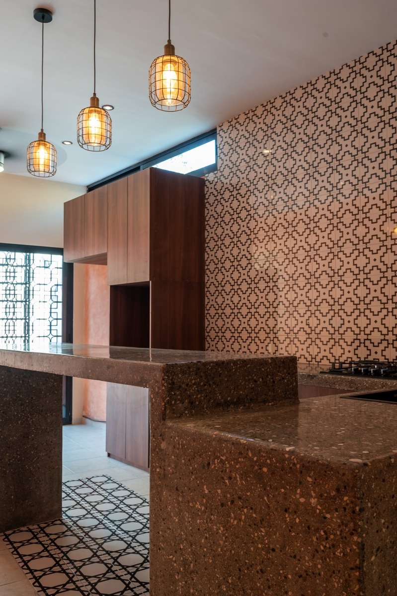 - Cocina con barra de terrazo, parrilla de gas y tarja.