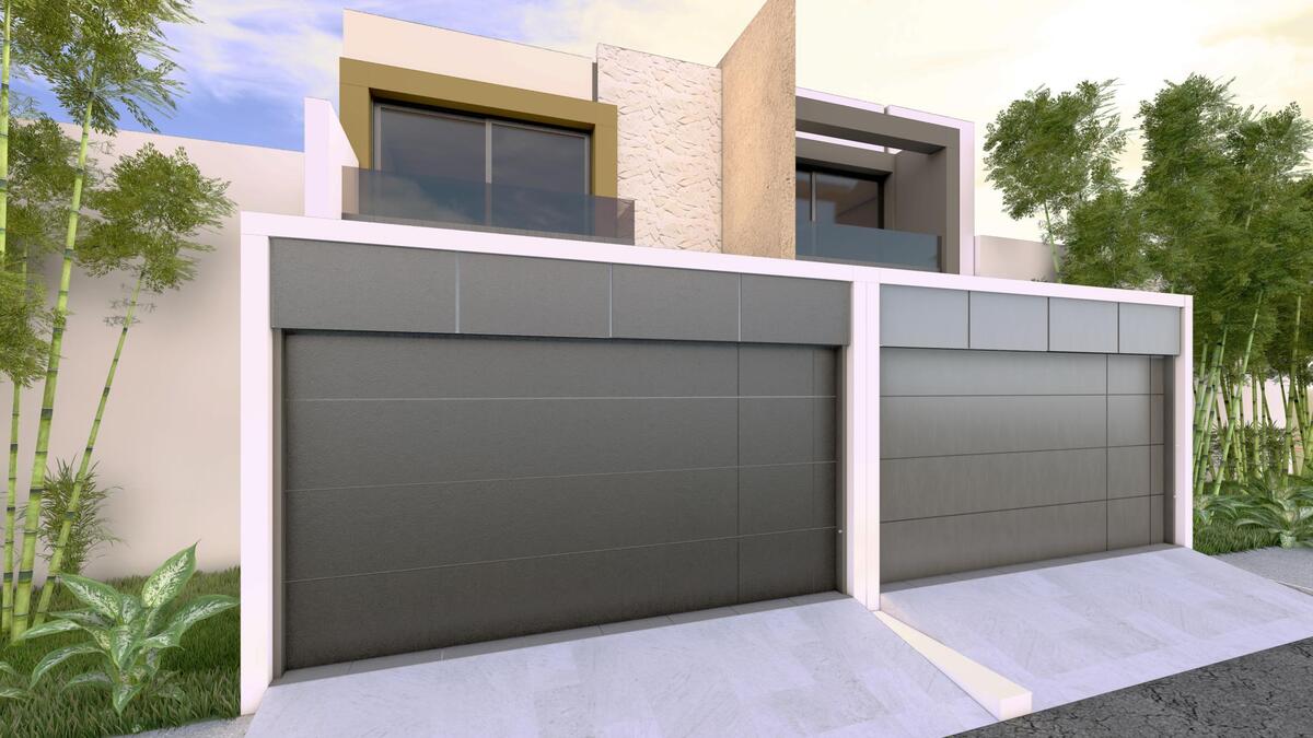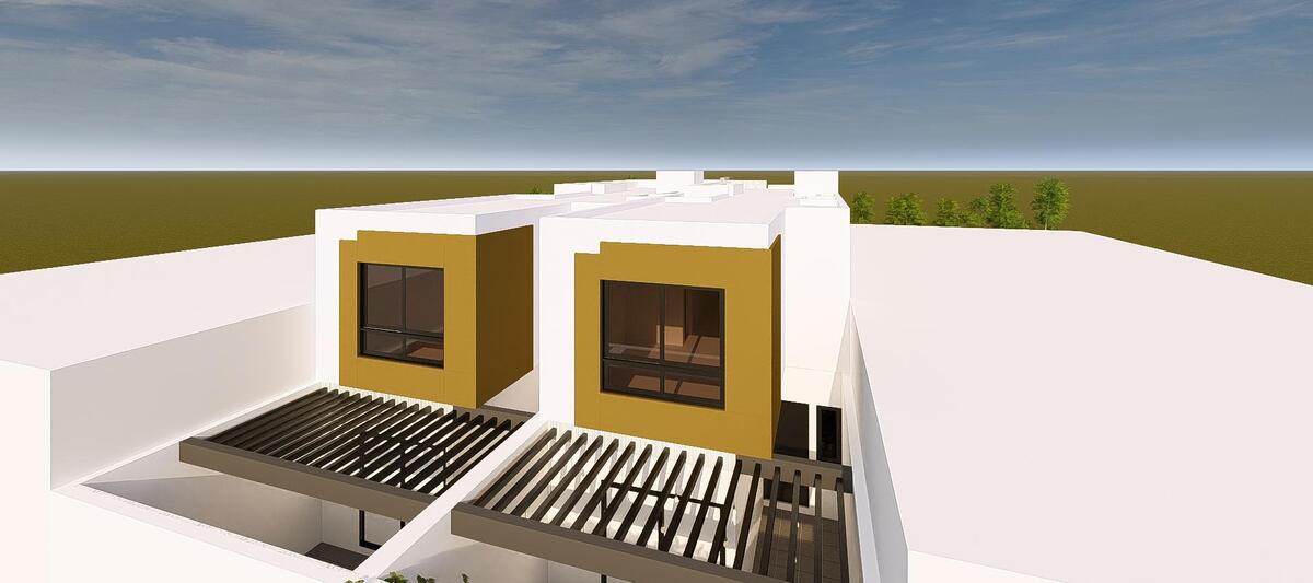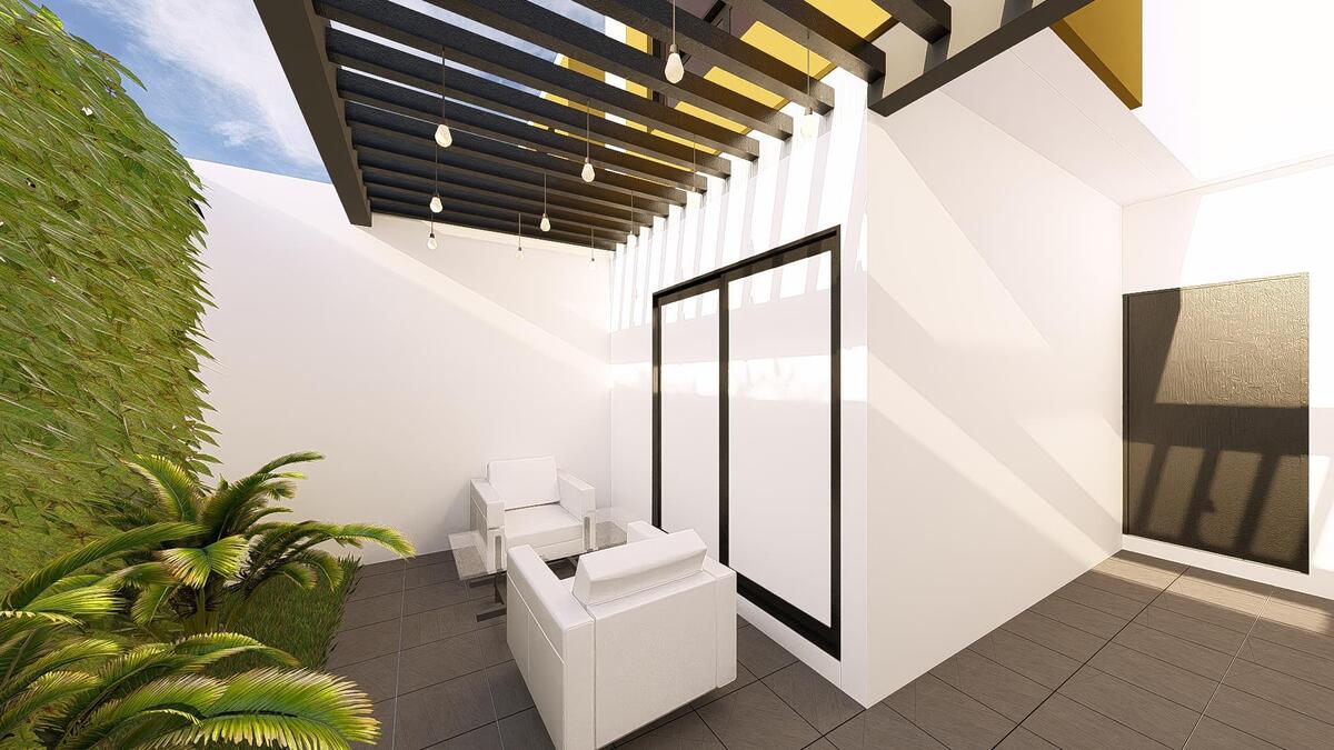 Garaje techado para dos automóviles, área de sala, comedor, cocina integral equipada con barra desayunadora, parrilla y campana, patio intermedio de ventilación, recámara con clóset, baño completo compartido, terraza con jardín y bodega debajo de escaleras.