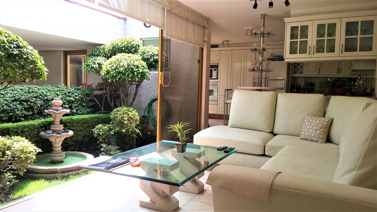 Cuenta con cocina equipada abierta con gran capacidad de almacenamiento y barra que se integra a un amplio Family Room con jardín exterior y fuente, el cual proporciona una gran ventilación e iluminación natural a estas áreas