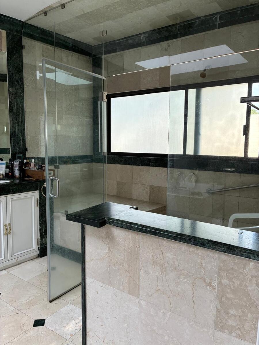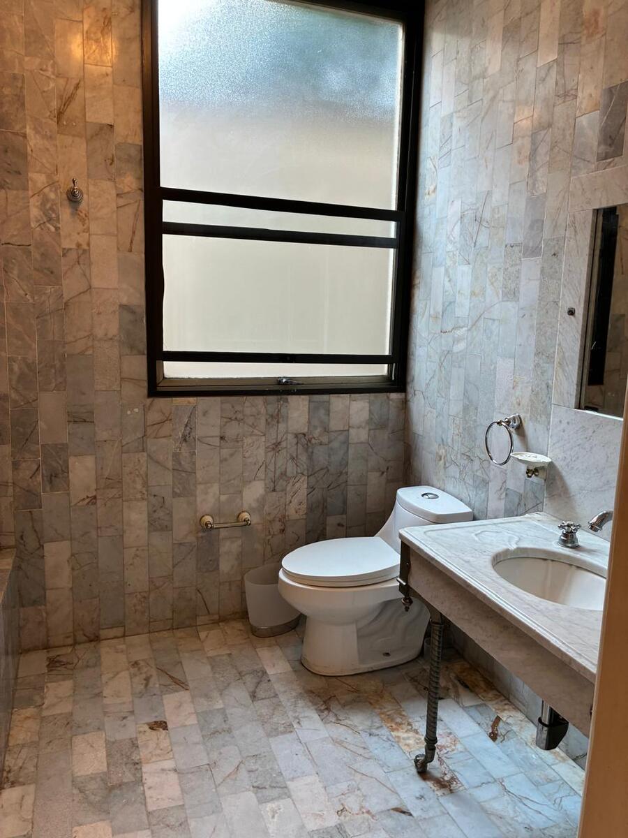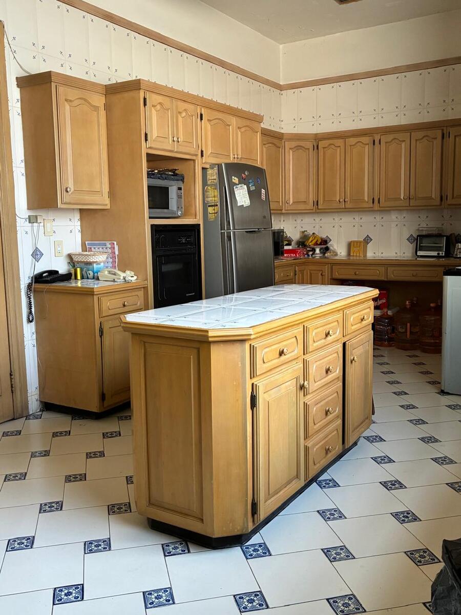 Cómoda casa de una sola planta con tres recámaras, tres y medio baños, sala, comedor, cocina integral, cuarto de servicio con baño y estacionamiento para 5 coches, dos de ellos techados.