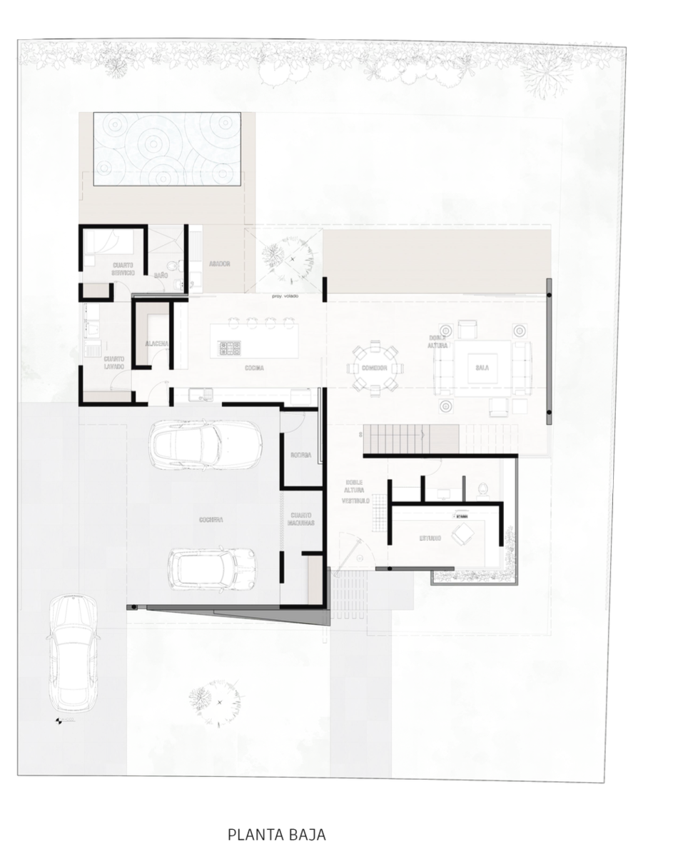PB : entrada con recibidor con sala y comedor a doble altura, ventanales de piso a techo, cocina integral equipada, baño de visitas, estudio, bodega, alacena, cuarto de lavado, cuarto de servicio con baño completo, jardin con terraza, asador y alberca, estacionamiento techado.