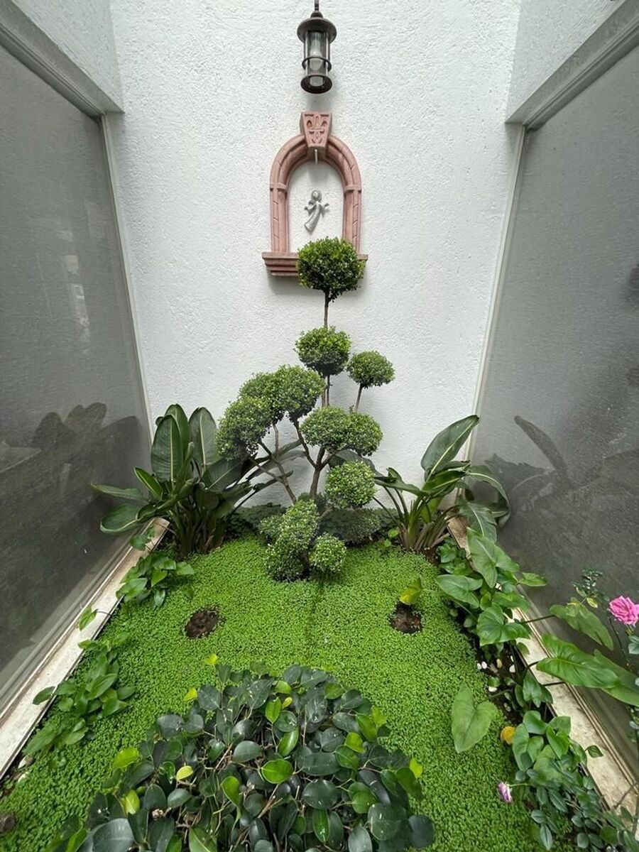 Estancia, comedor , medio baño de visitas con ventilación . Cocina integral equipada. Despensa independiente, Jardin con muro lloron,