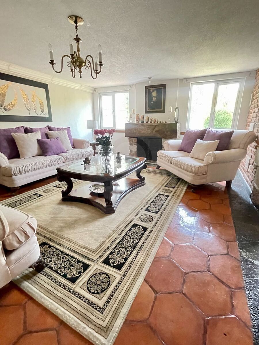 *Large living room with beautiful fireplace, indirect lighting for art illumination. Decorative beams in accesses and exposed red bricks.