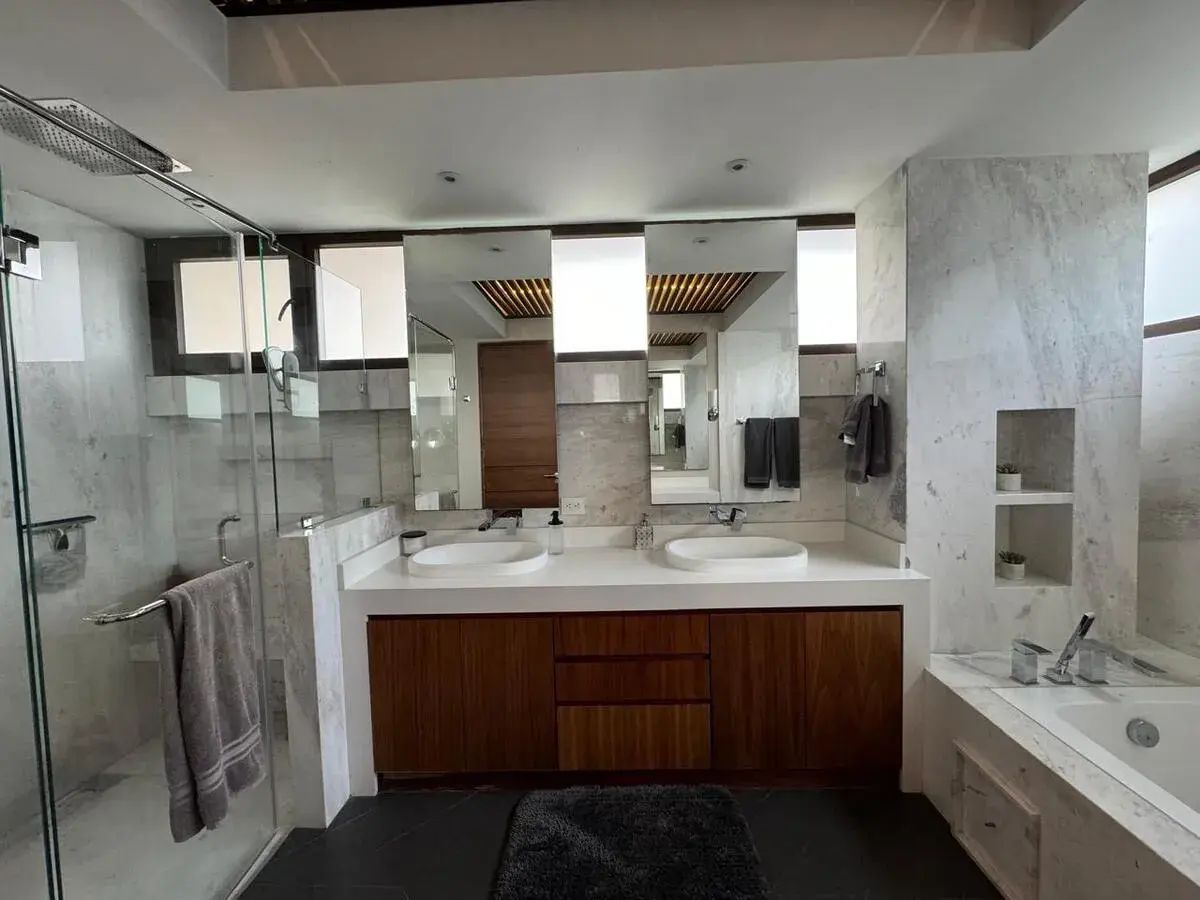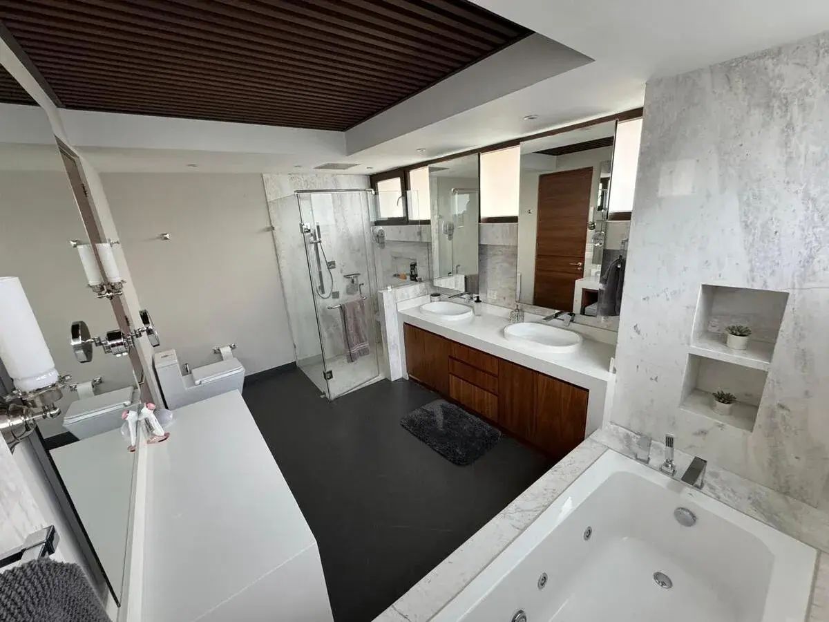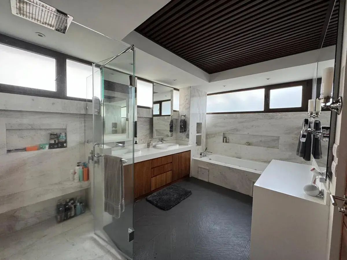 - Baño principal con regadera y tina, tocador, doble lavabo y wc en gabinete separado.