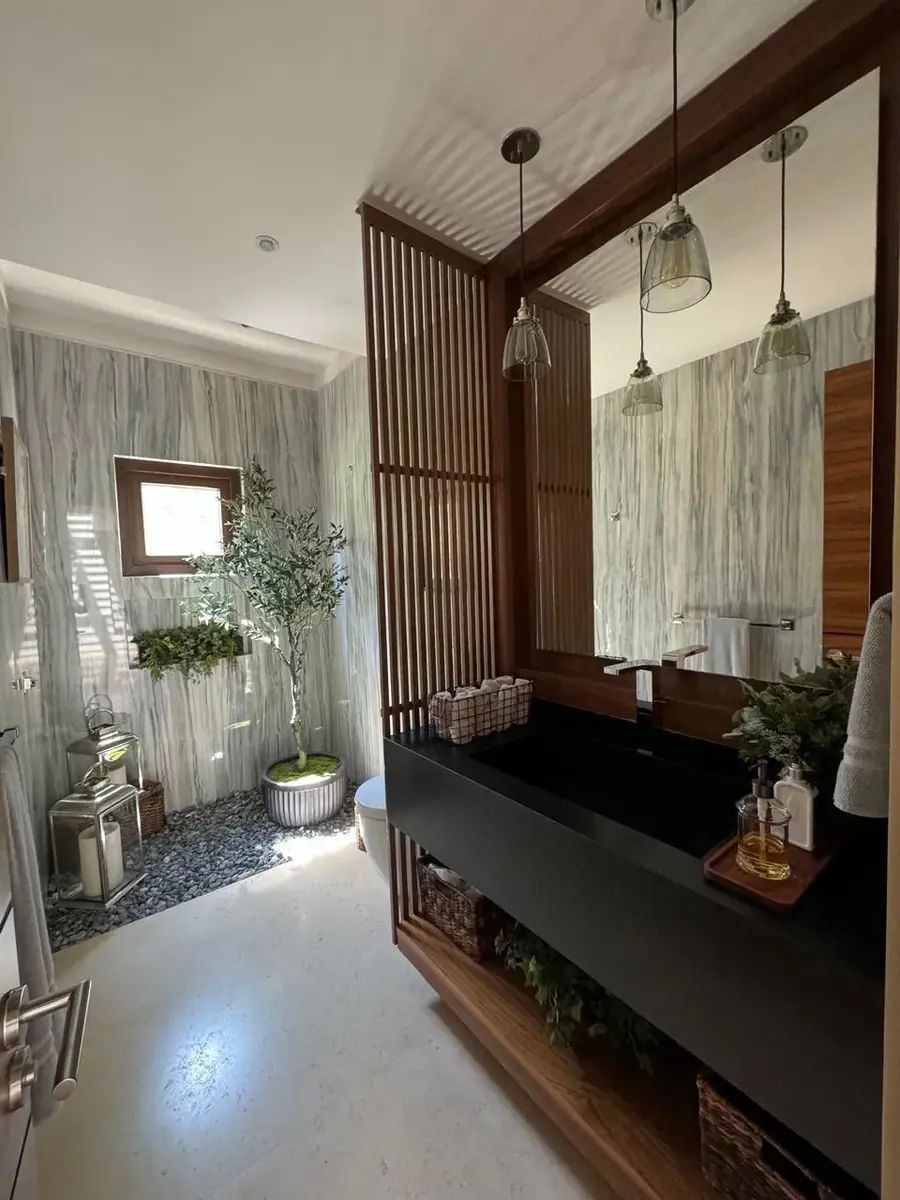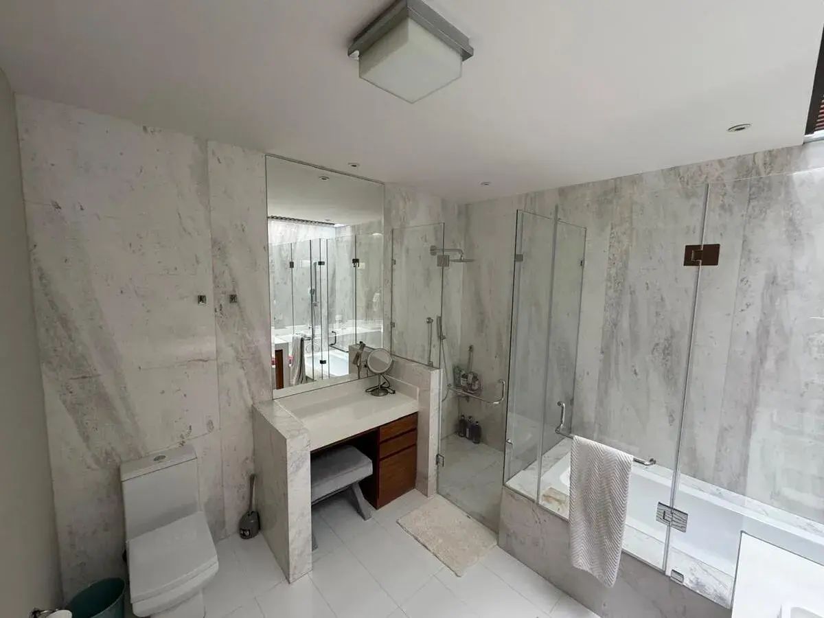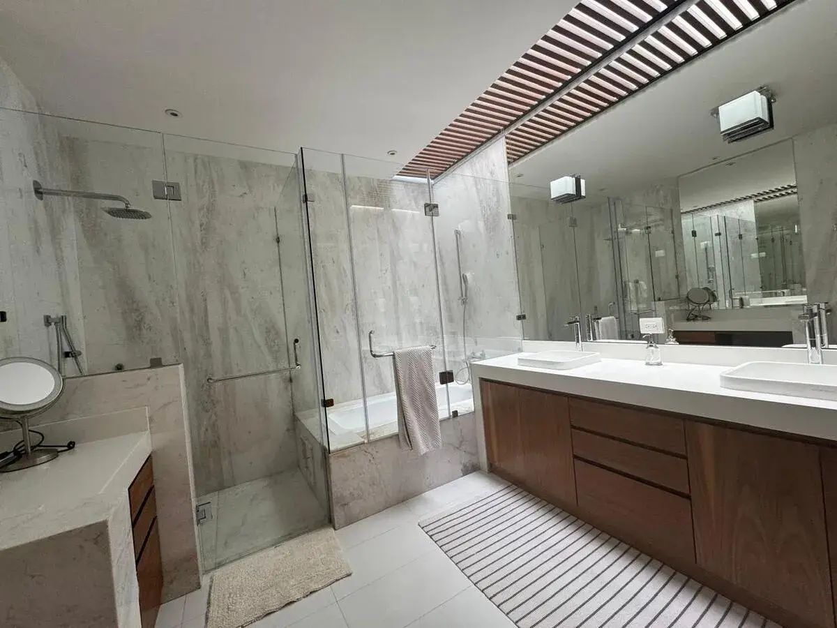 - Baño principal con regadera y tina, tocador, doble lavabo y wc en gabinete separado.