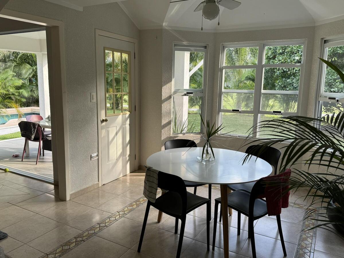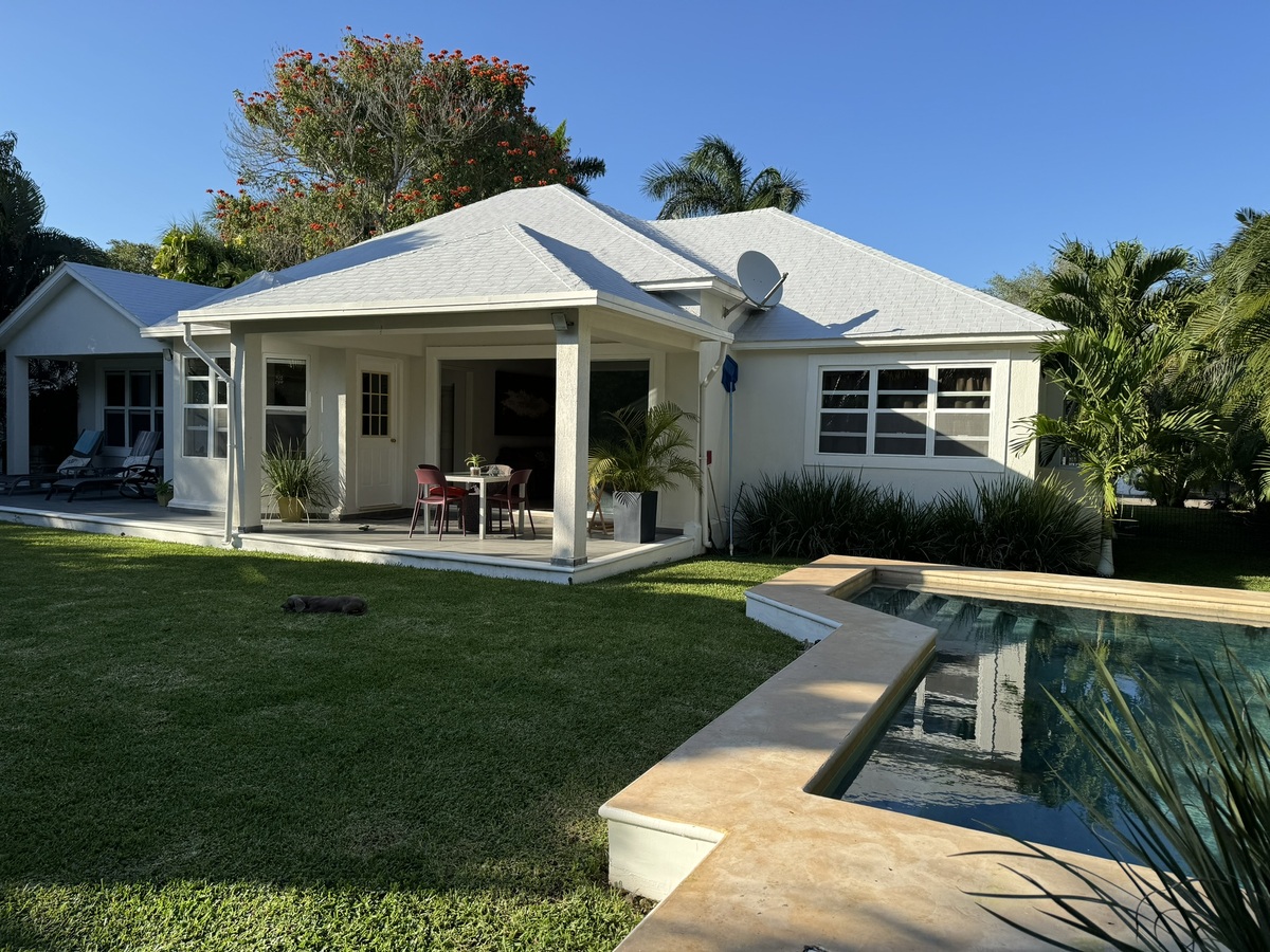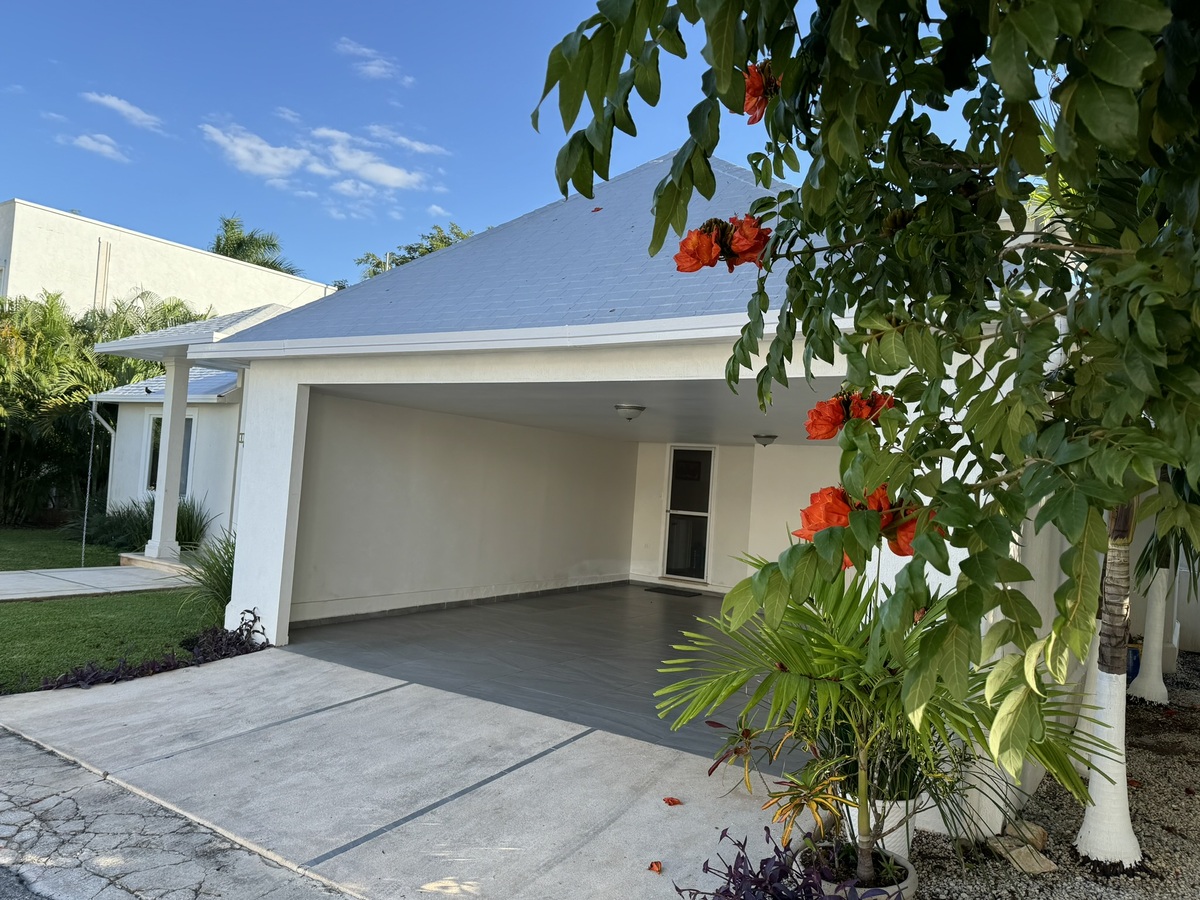 Una parte del jardĂn está delimitado por palmas arecas, lo cual le da privacidad por el paso de los golfistas, asĂ como una pequeña cerca ciclĂłnica