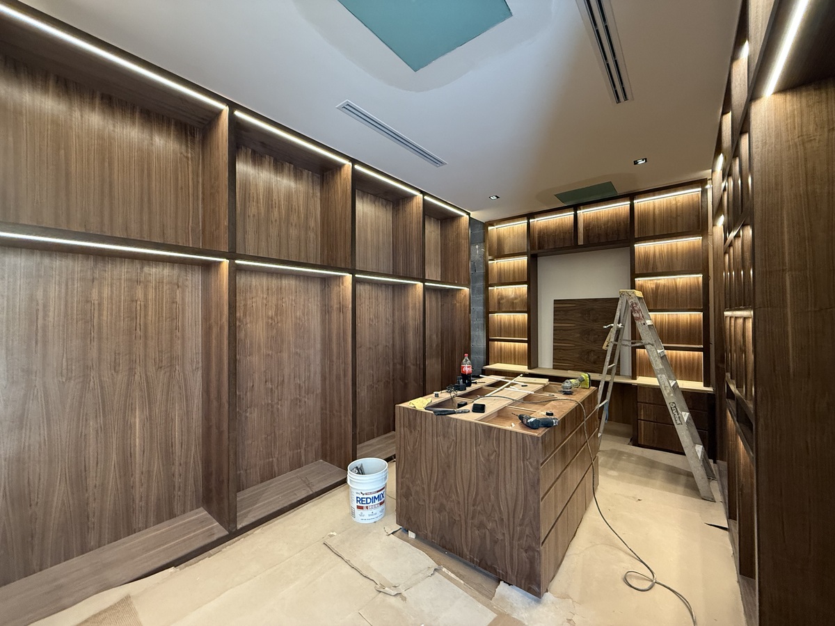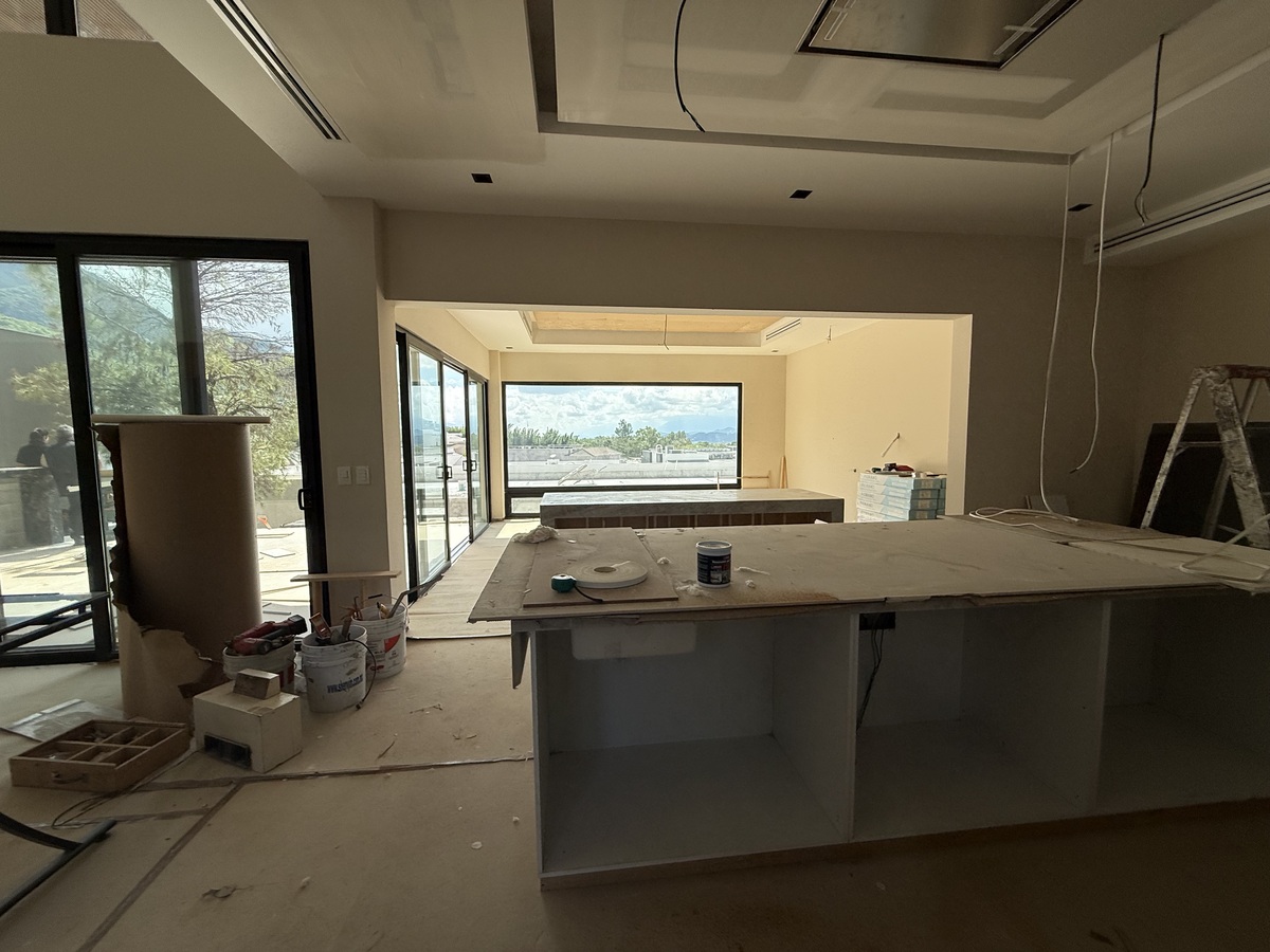 Planta baja: habitación completa para visitas o adultos mayores; cocina integral con isla, barra desayunadora y acabados finos de madera, cubierta de mármol.