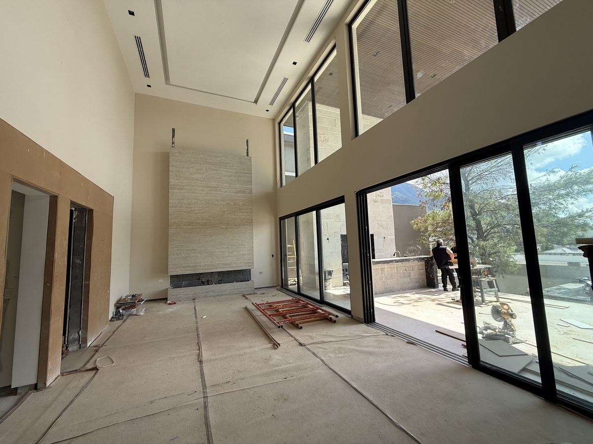 Distribución social: comedor y amplia sala con chimenea; puertas corredizas que conectan con el área social.