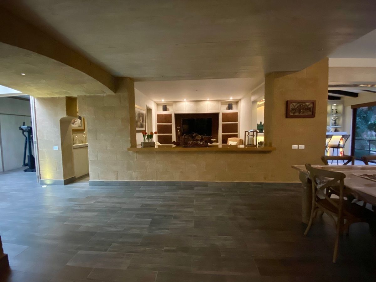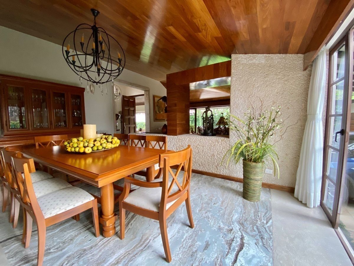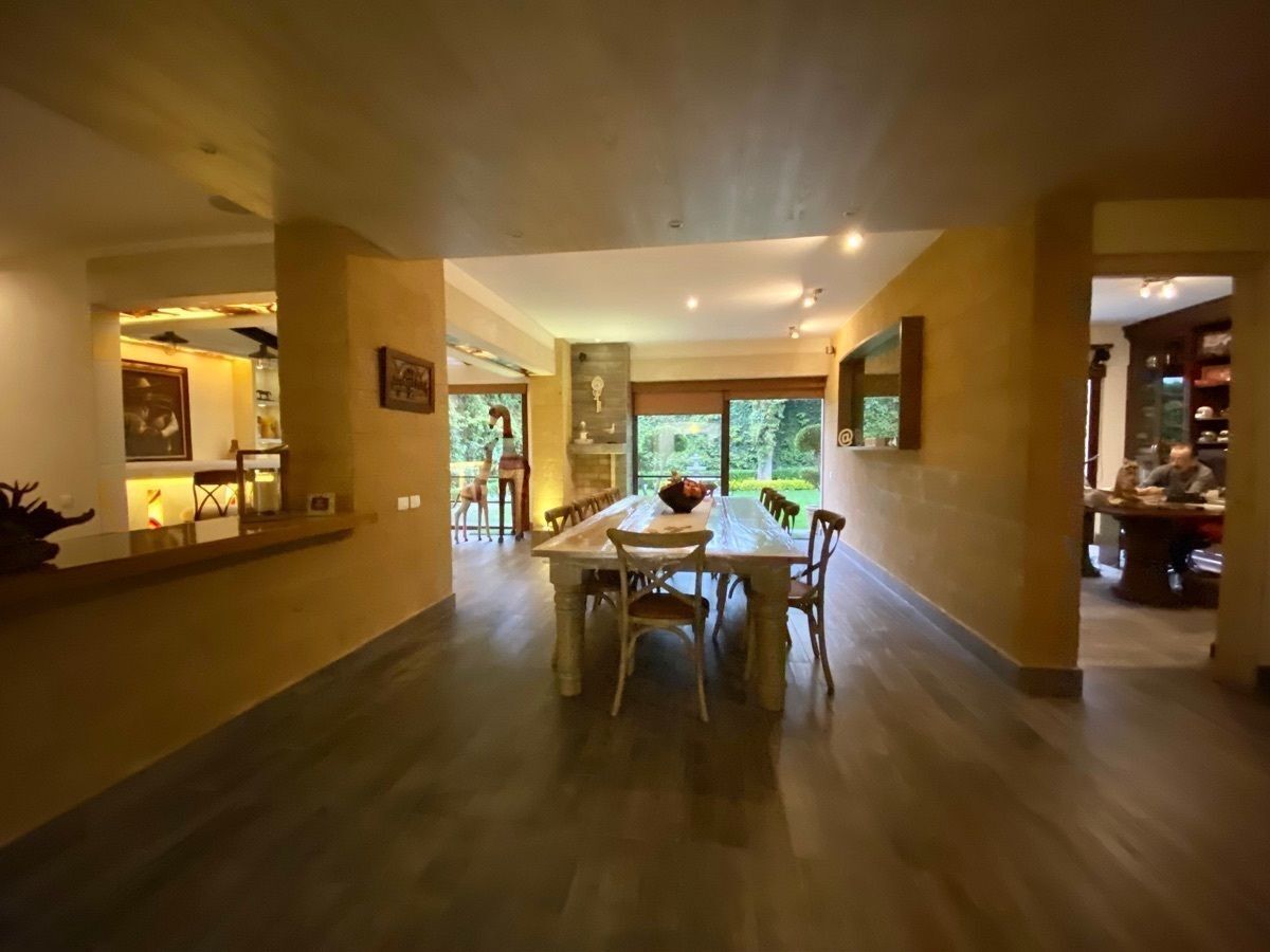 Cuenta con vestíbulo de entrada y sala de visitas con salida a una terraza, comedor y sala principal con chimenea y techos de madera muy altos, medio baño de visitas, cava, cocina integral con cubiertas de corian y antecomedor.