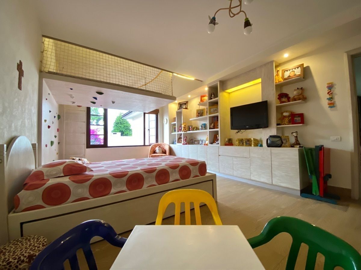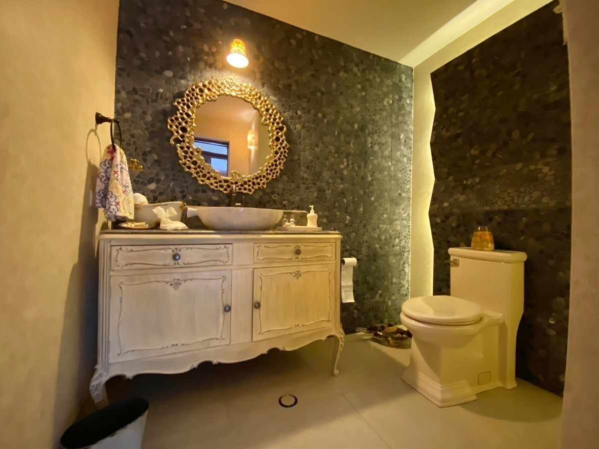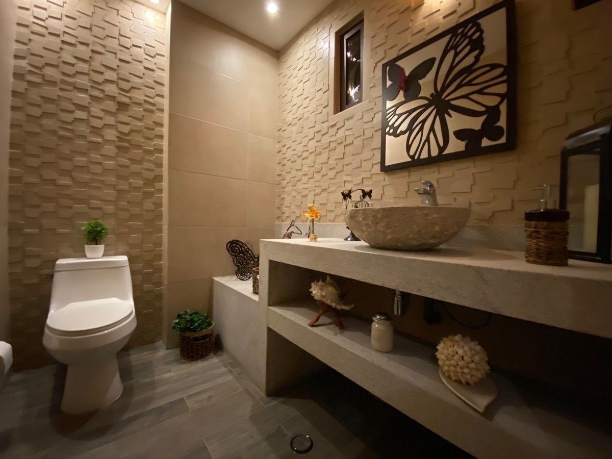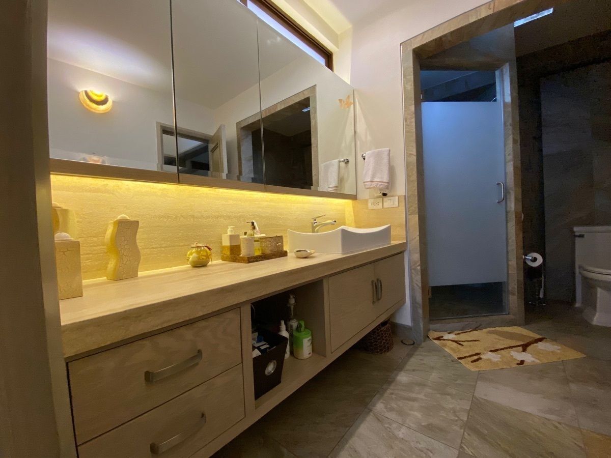 Multipurpose room with access to a beautiful garden, it has a bar with a counter, wine cellar, office, kitchenette, 2 guest bathrooms, TV room (which can be converted into bedroom 3), gym, storage room, parking for 3 covered cars, cistern, laundry area with utility room, service room with bathroom and solar panels.