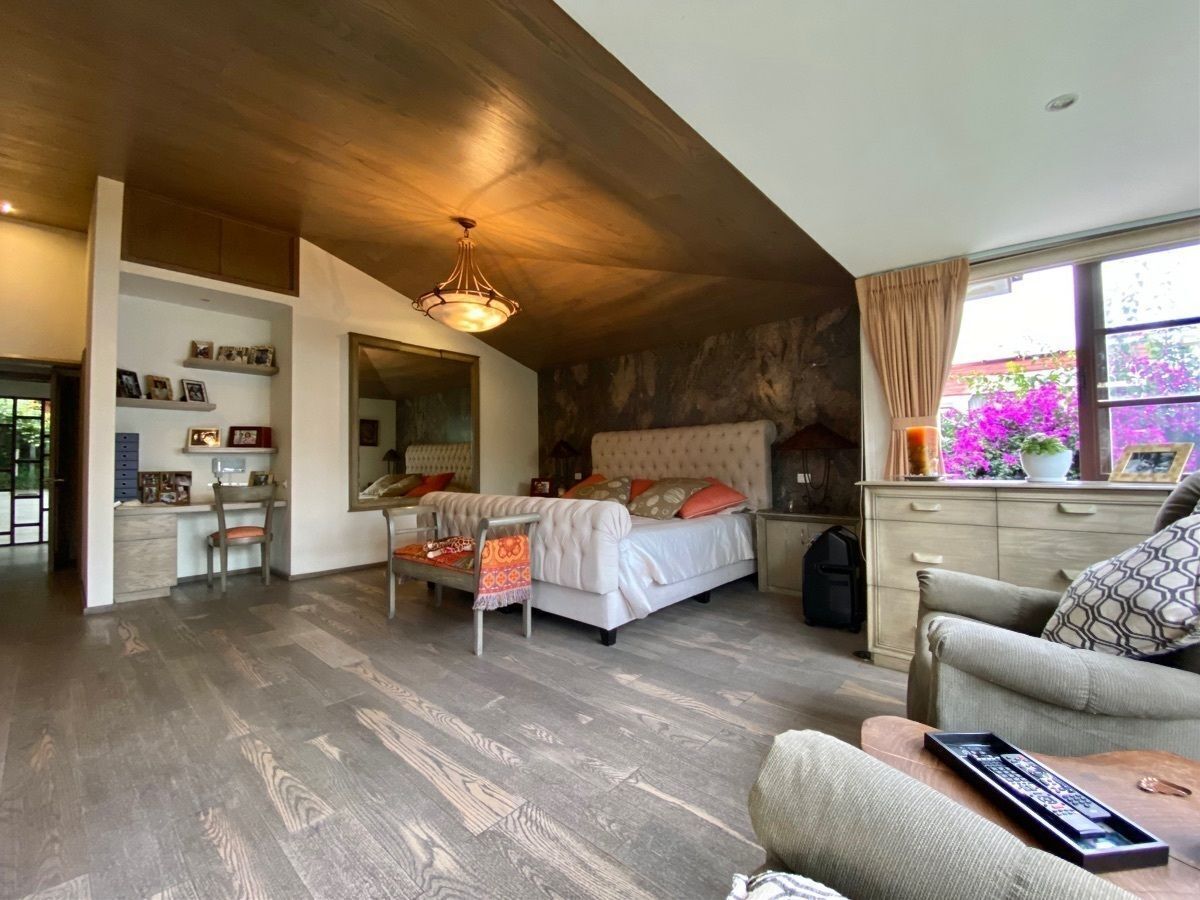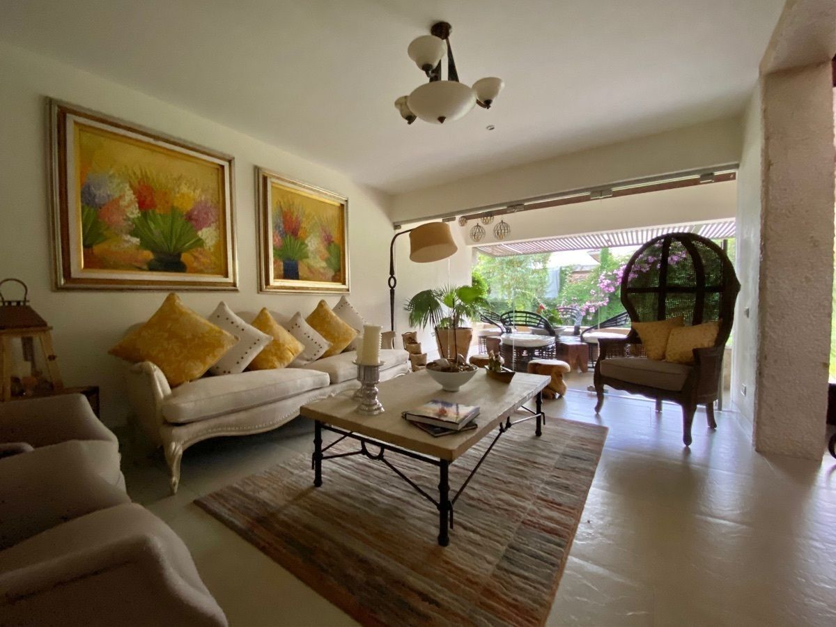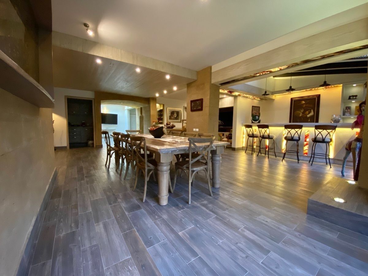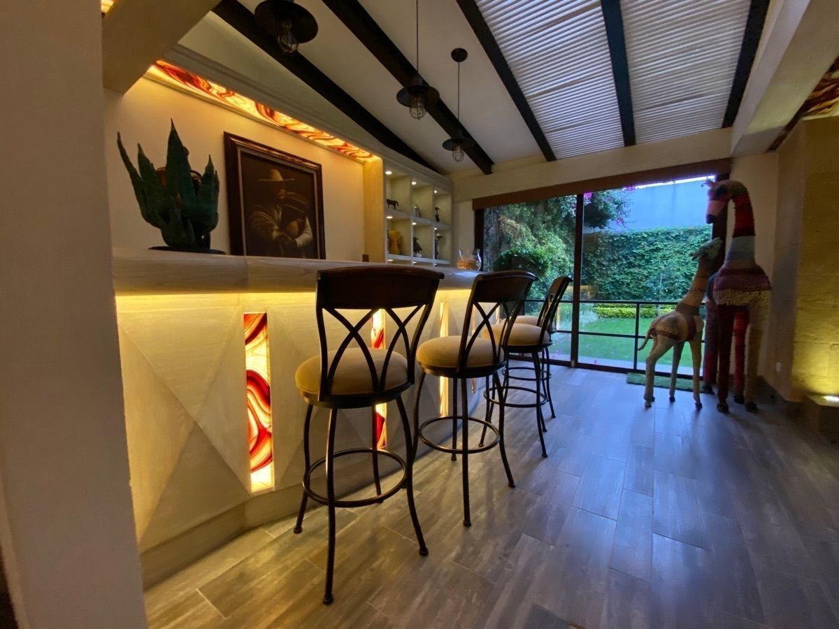 Salón de usos múltiples con salida a un hermoso jardín, cuenta con un bar con barra , cava, despacho, cocineta, 2 baños de visitas, sala de TV (se puede convertir en la recamara 3) gym, bodega, estacionamiento para 3 autos techados, cisterna, área de lavado con zotehuela, cuarto de servicio con baño y paneles solares.