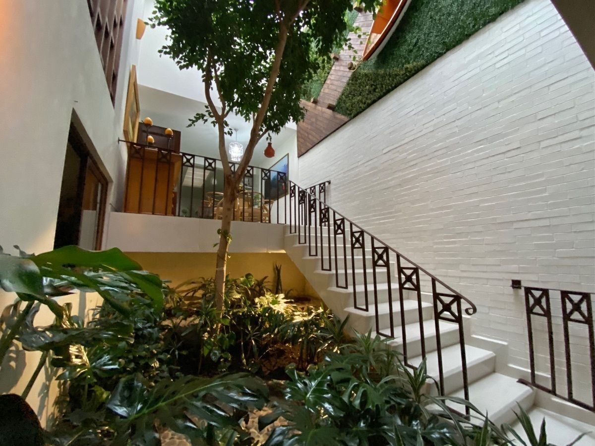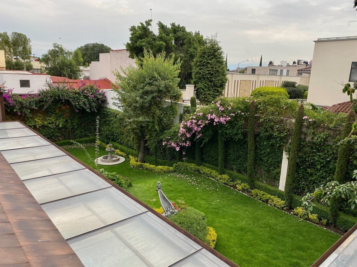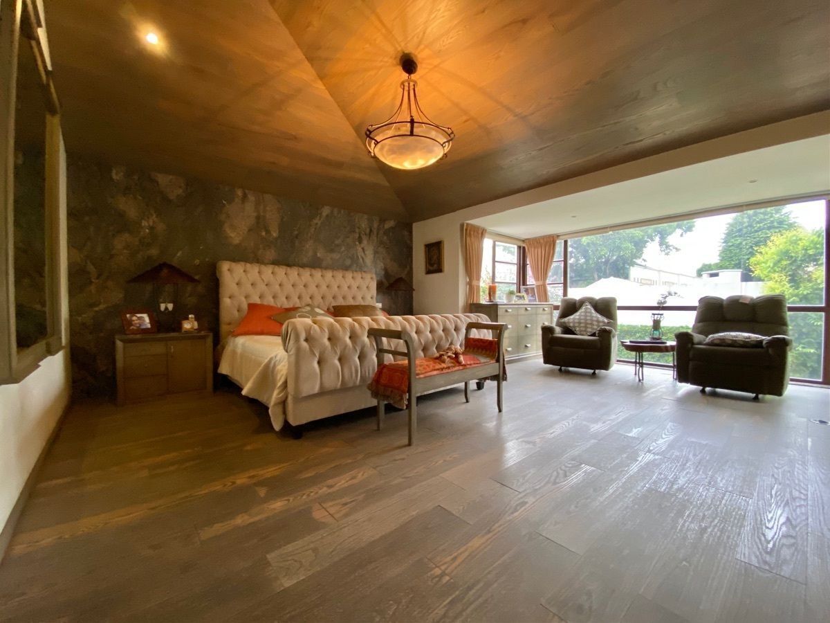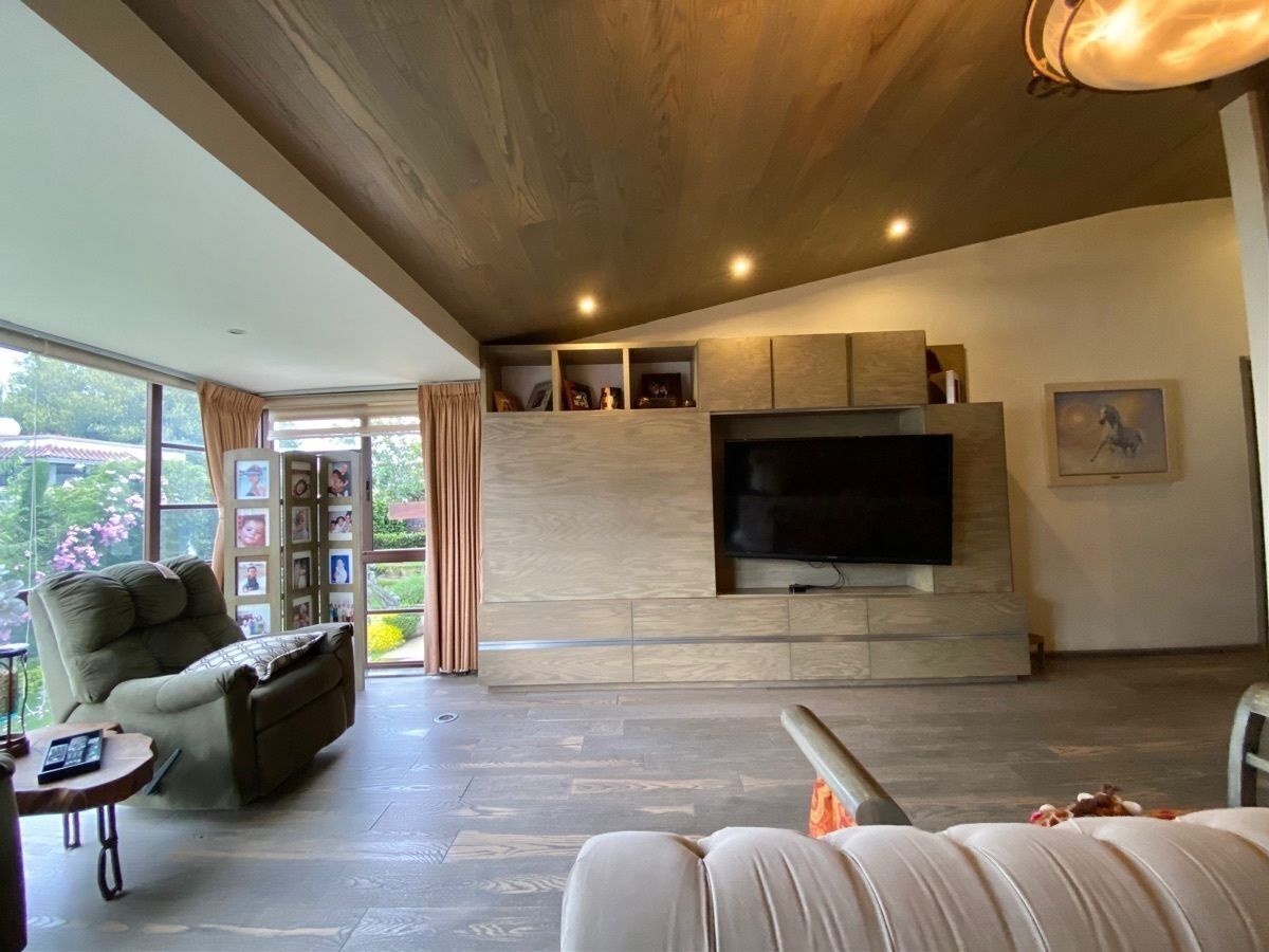 Salón de usos múltiples con salida a un hermoso jardín, cuenta con un bar con barra , cava, despacho, cocineta, 2 baños de visitas, sala de TV (se puede convertir en la recamara 3) gym, bodega, estacionamiento para 3 autos techados, cisterna, área de lavado con zotehuela, cuarto de servicio con baño y paneles solares.