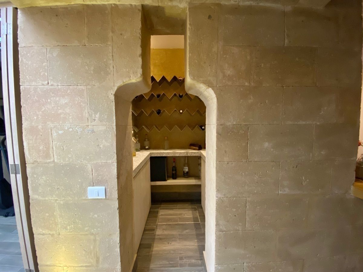 It features an entrance hall and a guest room with access to a terrace, dining room, and main living room with a fireplace and very high wooden ceilings, a half bath for guests, a wine cellar, a fully equipped kitchen with Corian countertops and a breakfast nook.