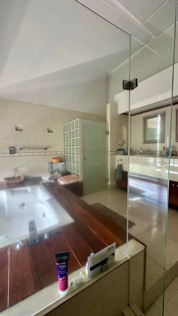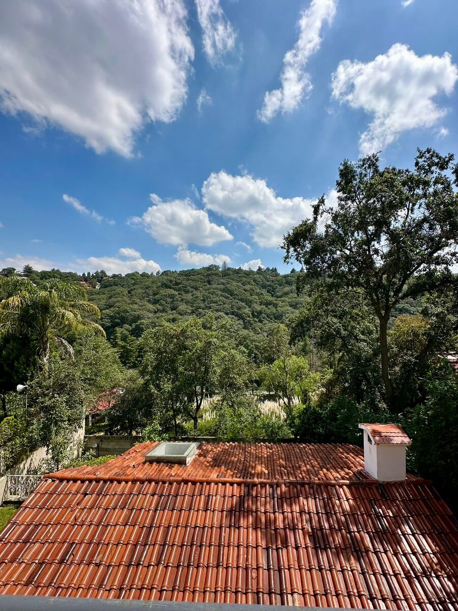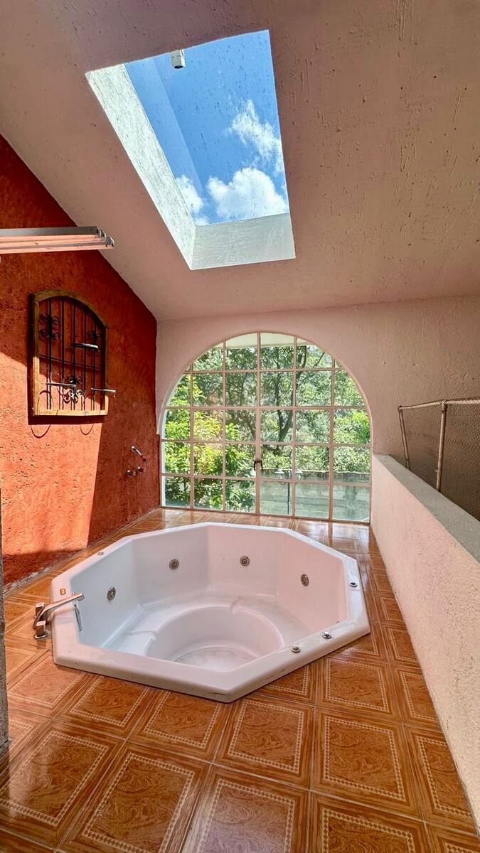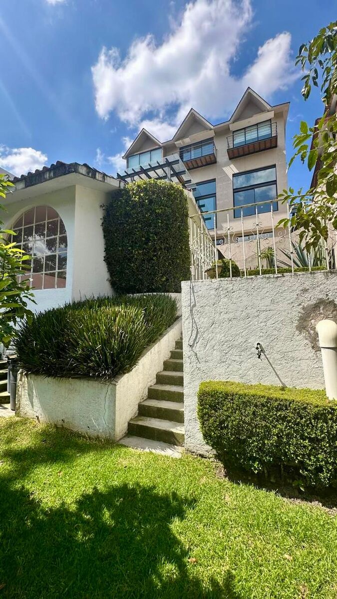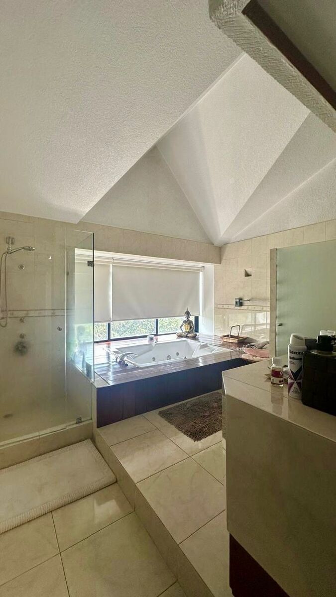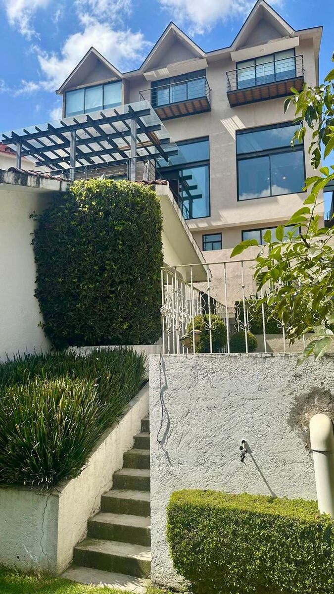 Additionally, it has a cabin with a jacuzzi and space for a living or dining room.Casa en venta, cuenta con 4 pisos, en el piso 4 esta la recamara principal muy amplia, con vestidor y baño completo remodelada, una segunda recamara con vestidor y baño completo y una tercera que se utiliza como oficina que podría ser otra recamara, en el piso 3 es la entrada principal cuenta con espacio para sala con chimenea, medio baño y una recamara de visitas con baño completo, en este piso se encuentra el cuarto de lavado y cuarto de servicio, con vista a la sala comedor. El piso 2 hay un espacio para juegos de mesa, con medio baño, closet de vinos y cuarto obscuro para adaptarlo para almacenar vinos, en este piso encontramos sala comedor, bastante amplio, con salida a una gran terraza que cuenta con una vista espectacular, la cocina es integral tiene espacio para un antecomedor y salida a la terraza.