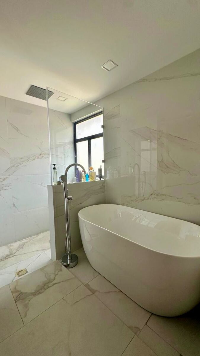 On the 1st floor, there is 1 bedroom with a full bathroom, another bedroom that can be used as a TV room with a terrace, and it is adapted for a barbecue space and garden.