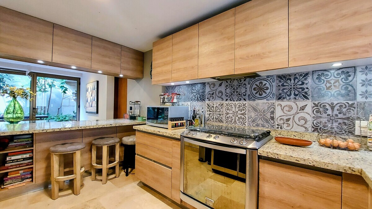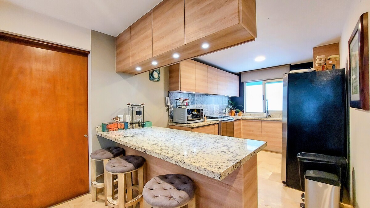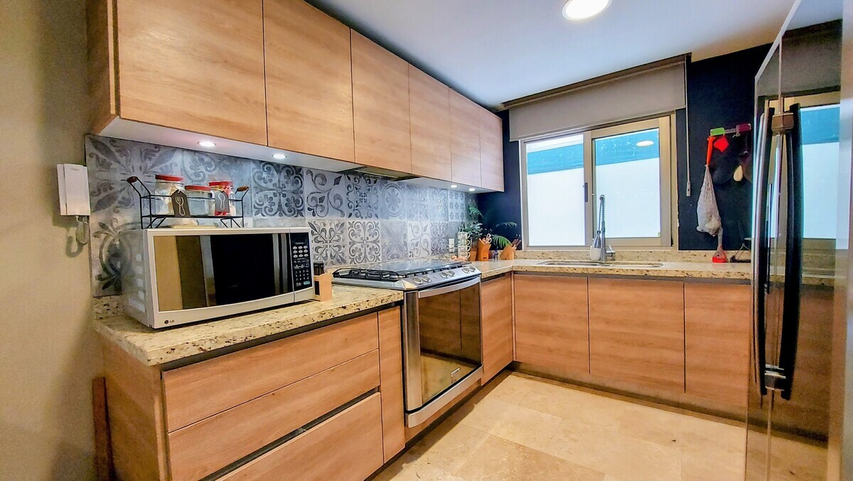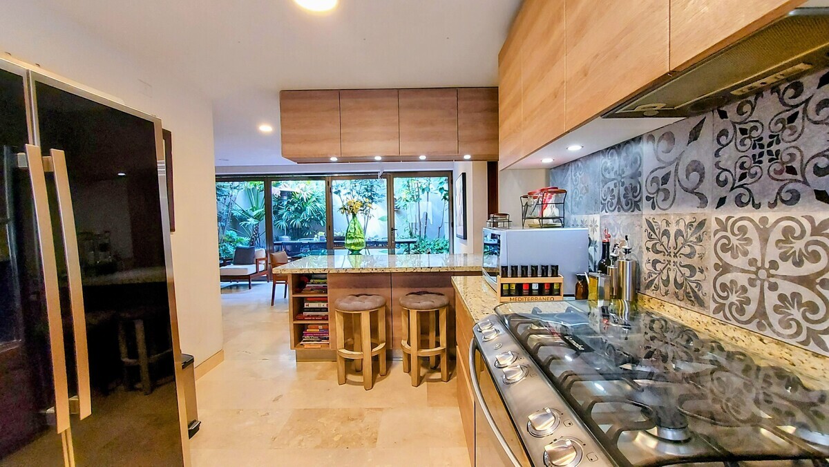 • Cocina integral abierta con barra de granito y acceso independiente a la terraza.