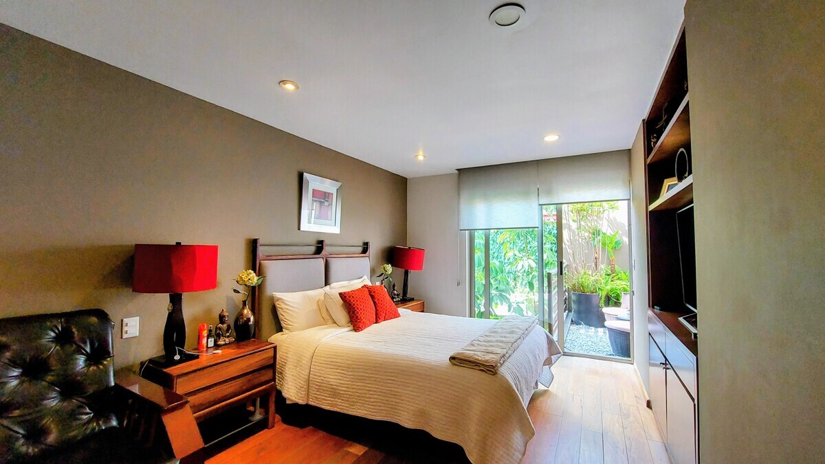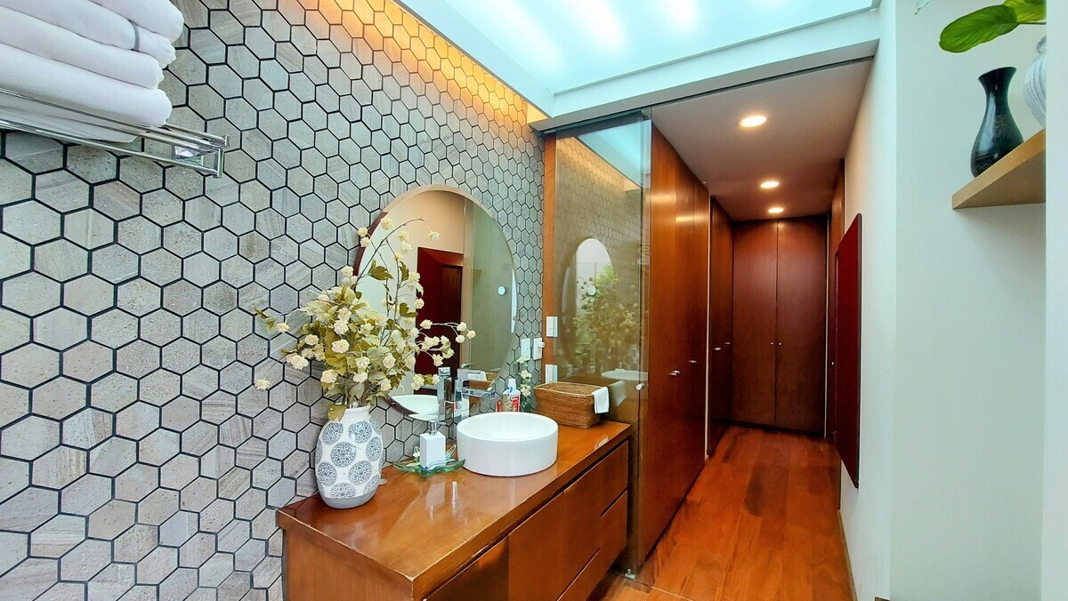 • Master bedroom with balcony overlooking the house's terrace, walk-in closet, full bathroom with a pleasant interior view and tempered glass partition.