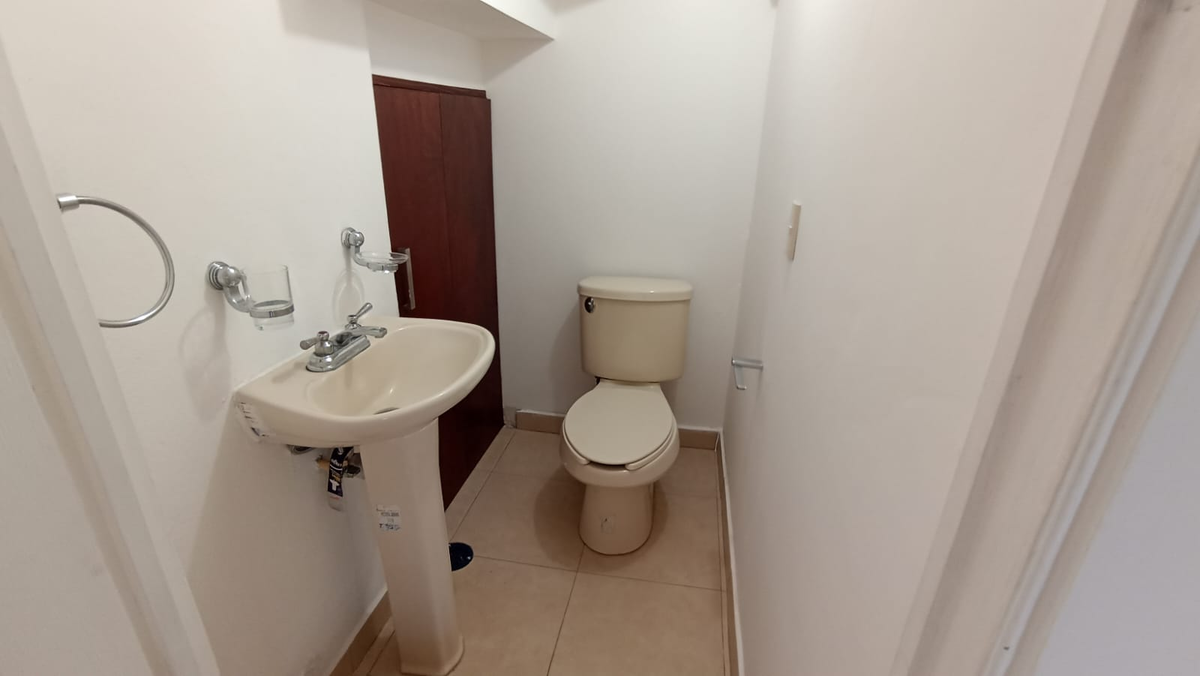 Tiene dos lugares de estacionamiento, medio baño, área de sala comedor, recamara en planta baja. cocina equipada, área de lavado techada, y patio; en planta alta tiene dos recámaras secundarias con closet que comparten un baño completo y recámara principal con closet y baño completo.