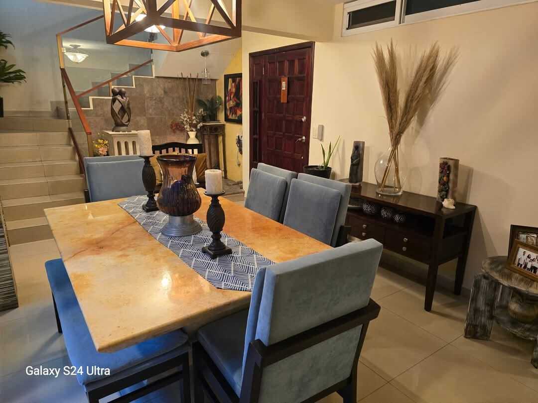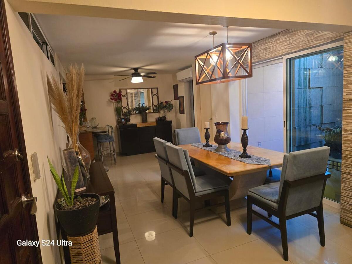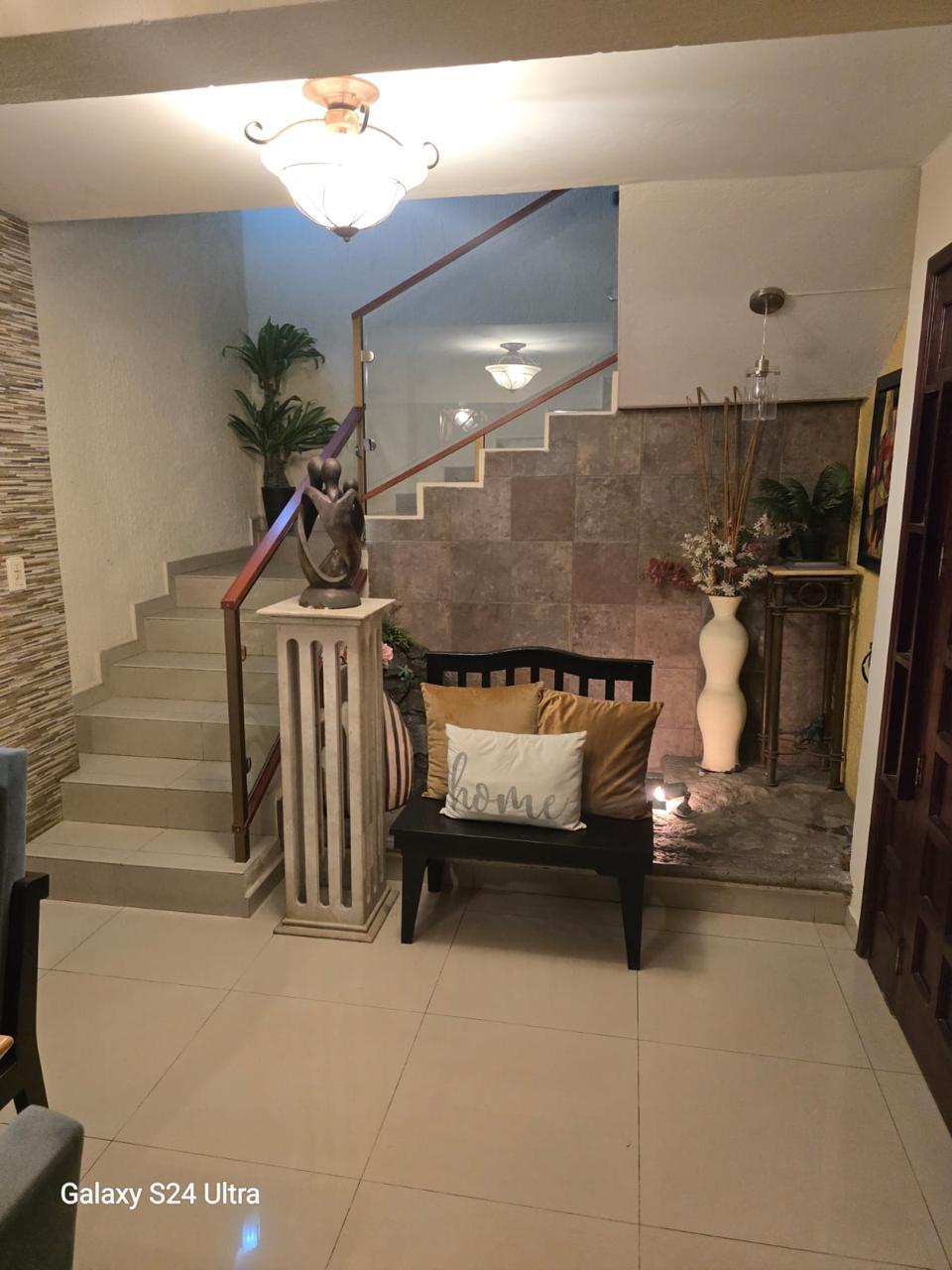 Hermoso recibidor con una cascada abajo de la escalera, sala comedor de un gran tamaño con minisplit, medio baño, cocina integral de cedro con granito totalmente equipada, la casa cuenta con un jardin interno que hace que tenga suficiente iluminacion, cuarto de lavanderia con pasillo para un patio de tender y una bodega .