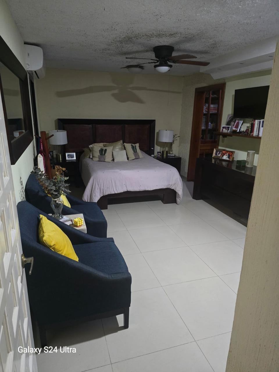 Recamara principal de gran tamaño con minisplit, con walking closet y baño con tina.