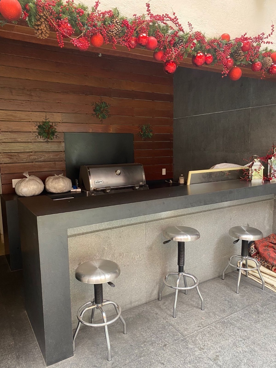 La cocina y el área de entretenimiento se fusionan perfectamente con una barra equipada con asador, ideal para cenas al aire libre y eventos sociales.