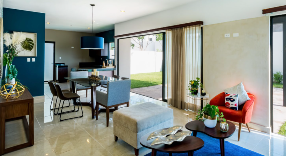 La casa cuenta con una distribución adecuada al entrar encuentras las escaleras semiocultas de lado derecho, inmediatamente que se abre la puerta encontramos la iluminación natural que los ventanales de la terraza proporcionan, percibiendo la calidez de la propiedad y junto que una de las habitaciones se encuentra en primer piso con baño completo permite con mayor accesibilidad a nuestros huéspedes o incluso tener el estudio o sala de entretenimiento, en el área común con diseño abierto, el comedor y la sala en corredor con la cocina, para que todos los que quieran convivir puedan estar en la reunión.