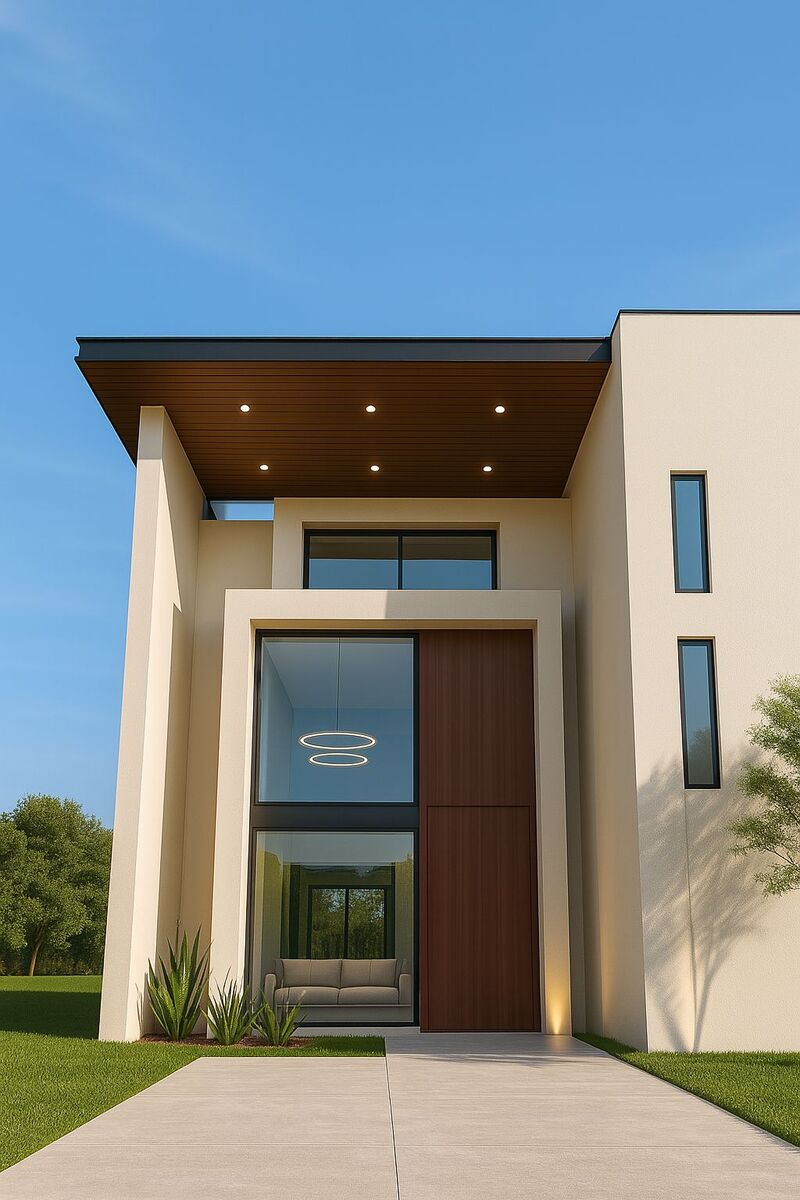 El acceso principal cuenta con doble altura y puerta de madera sólida, enmarcada por iluminación arquitectónica y plafones con acabados en madera, creando un ambiente elegante y acogedor.