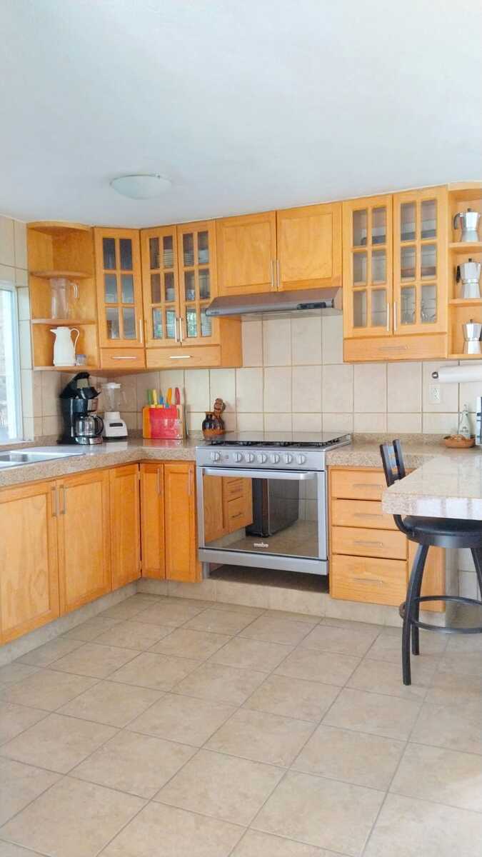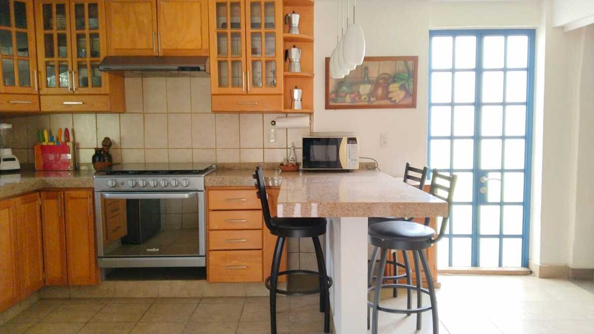 * Cocina con barra de desayunador de granito, alacenas amplias y doble lavabo.