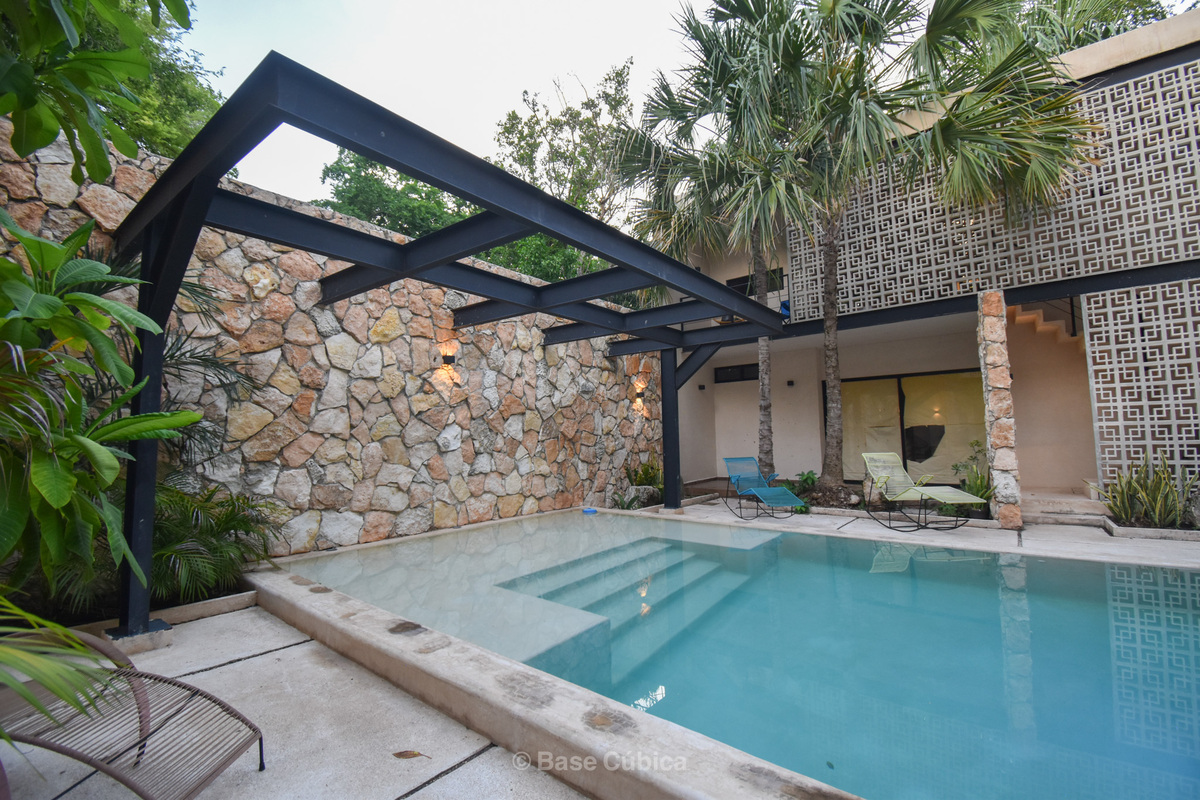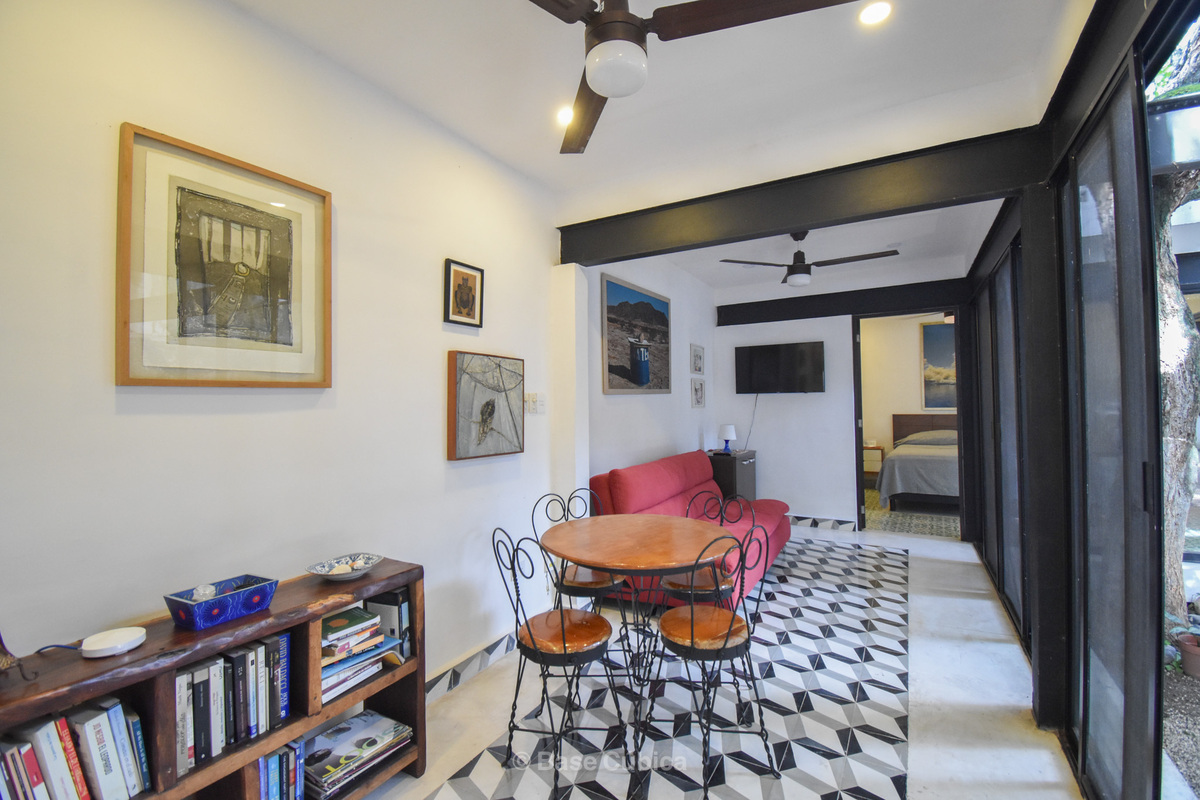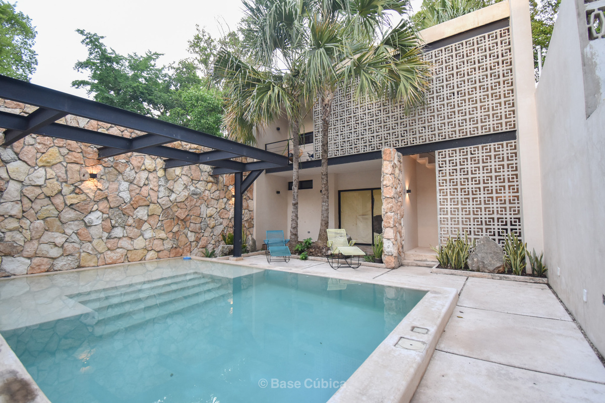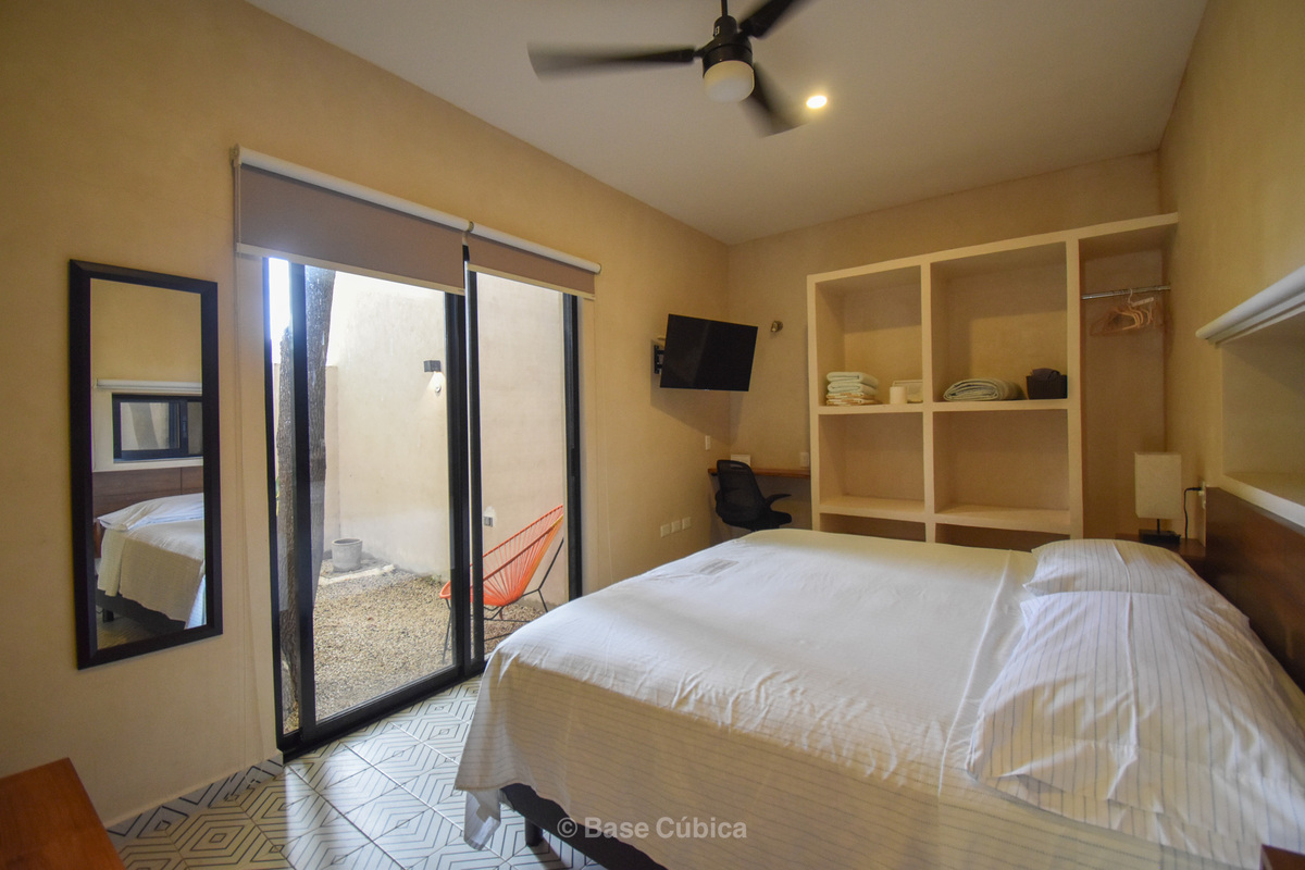 Depto. 2 (Xulab) y Depto. 3 (Turix): Planta alta, 1 recámara, baño completo, sala-comedor, cocina y dos terrazas (una privada y otra con vista a la piscina).