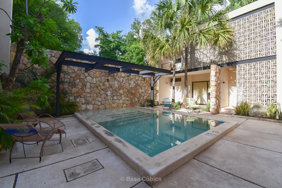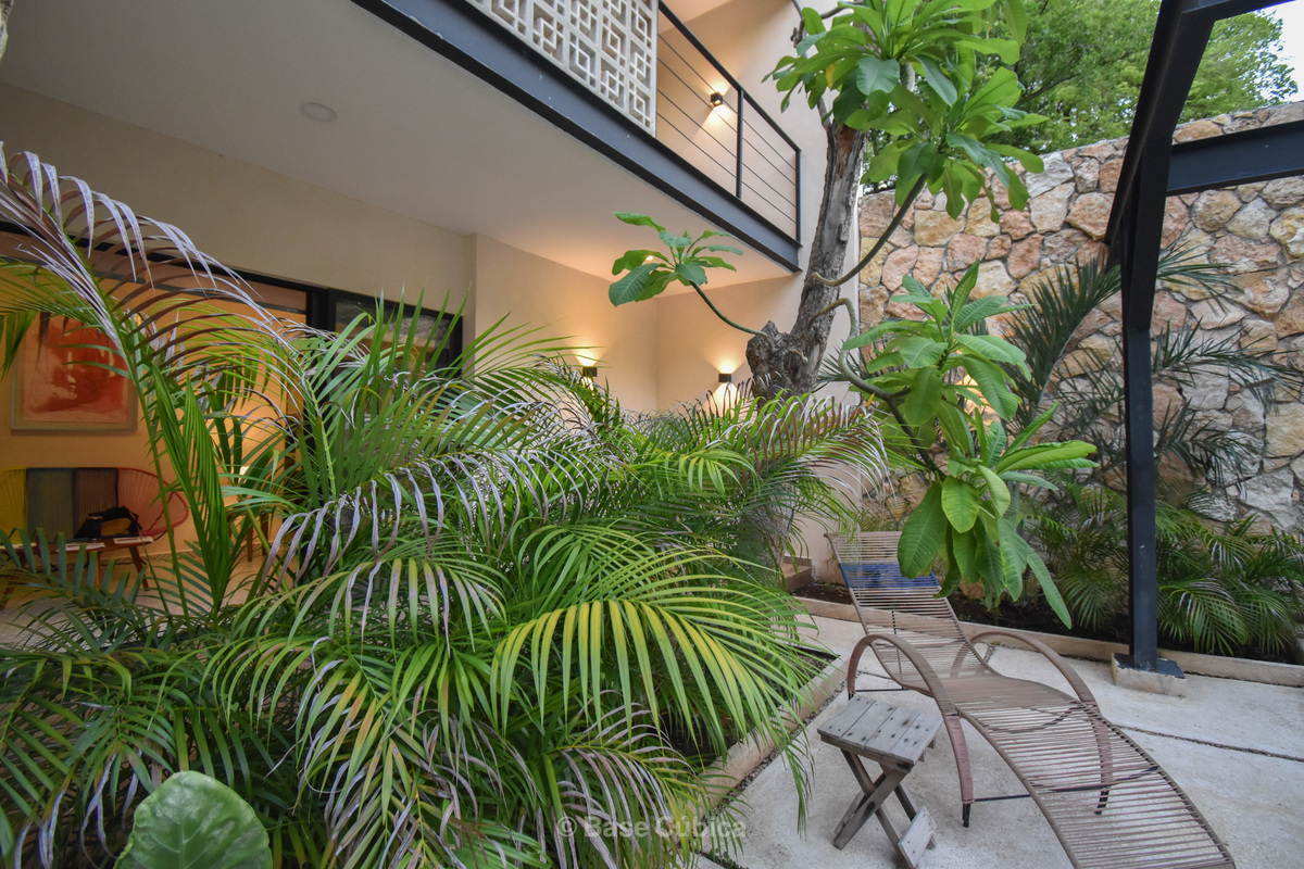 Depto. 1 (Chiuoh) y Depto. 4 (Otoch): Planta baja, 1 recámara, baño completo, sala-comedor, cocina y acceso a un jardín interior. Cuentan con terraza con vista a la piscina y acceso a las áreas comunes.