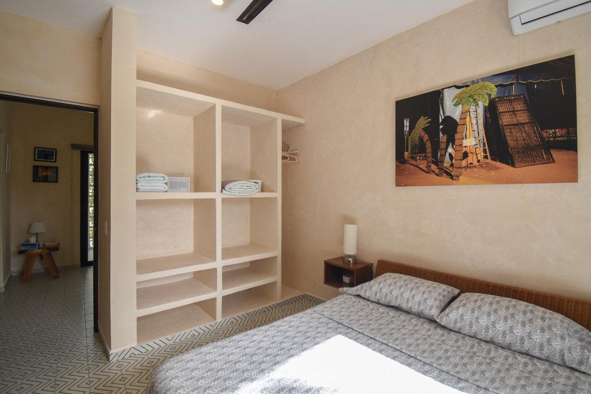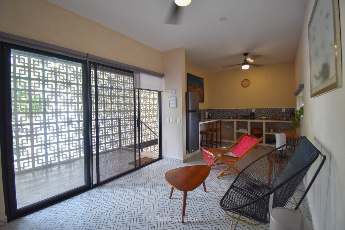 Equipamiento: Aire acondicionado, baño con tina, pisos de pasta, ventiladores, cancelería de aluminio, acabados de Chukum y pasta blanca. Se entrega amueblada con cama King Size, sofá, TV de 40”, comedor, estufa eléctrica, refrigerador y otros utensilios. Incluye bóiler eléctrico y wifi.