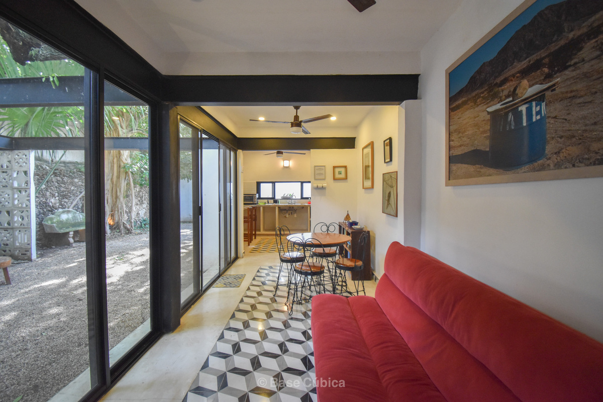 También en una sola planta, esta casa tiene 1 recámara con baño completo, sala-comedor, cocina con barra desayunadora y un jardín privado. Tiene acceso directo a la piscina y áreas comunes.
