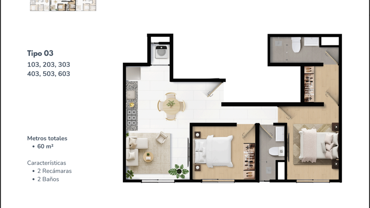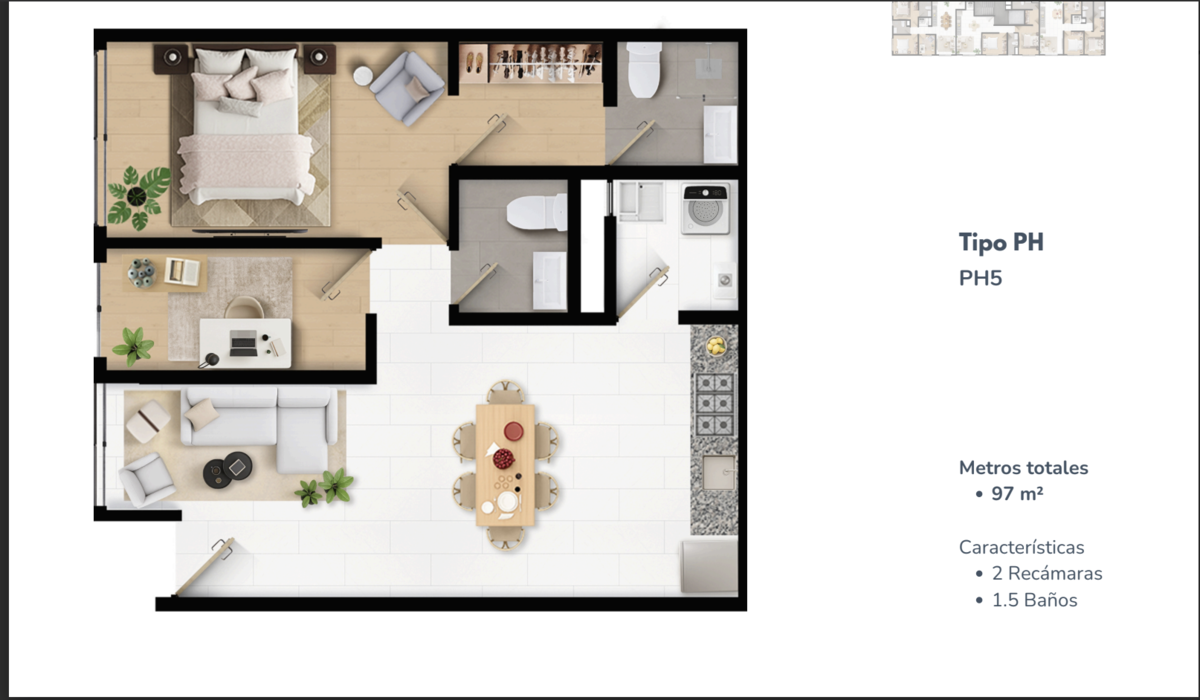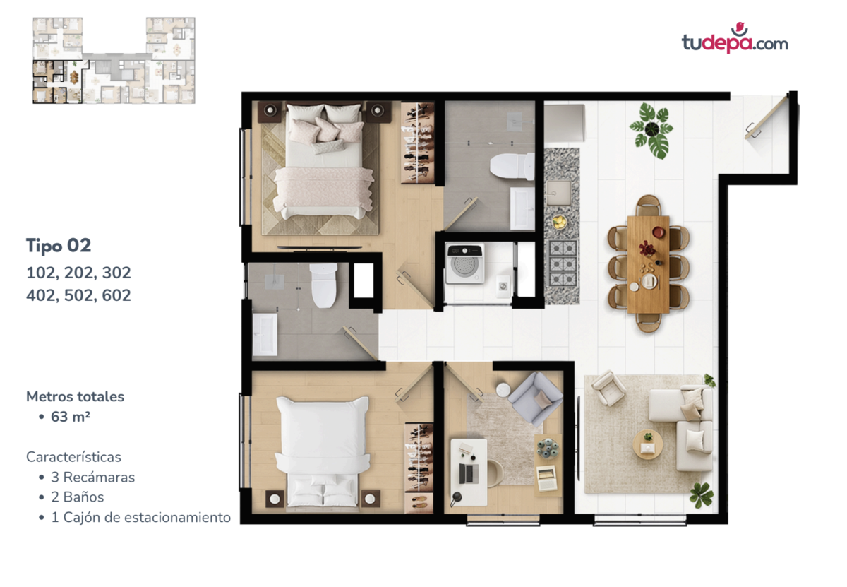 Cuenta con sala, comedor y cocina integral, ideal para preparar tus platillos favoritos. Dispone de 2 habitaciones con clóset y 1 baño completo, además de 1 medio baño para visitas.