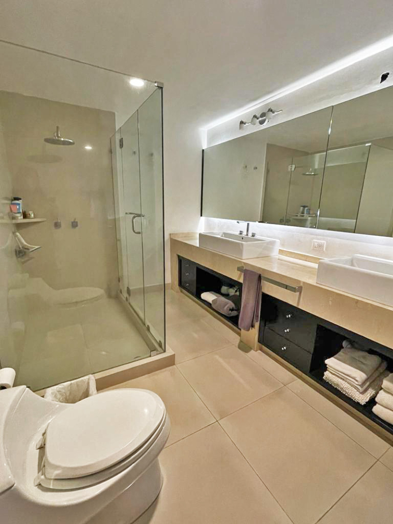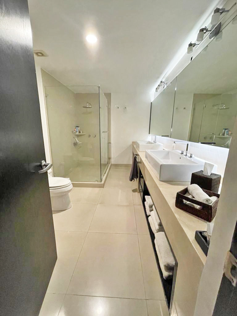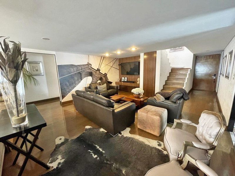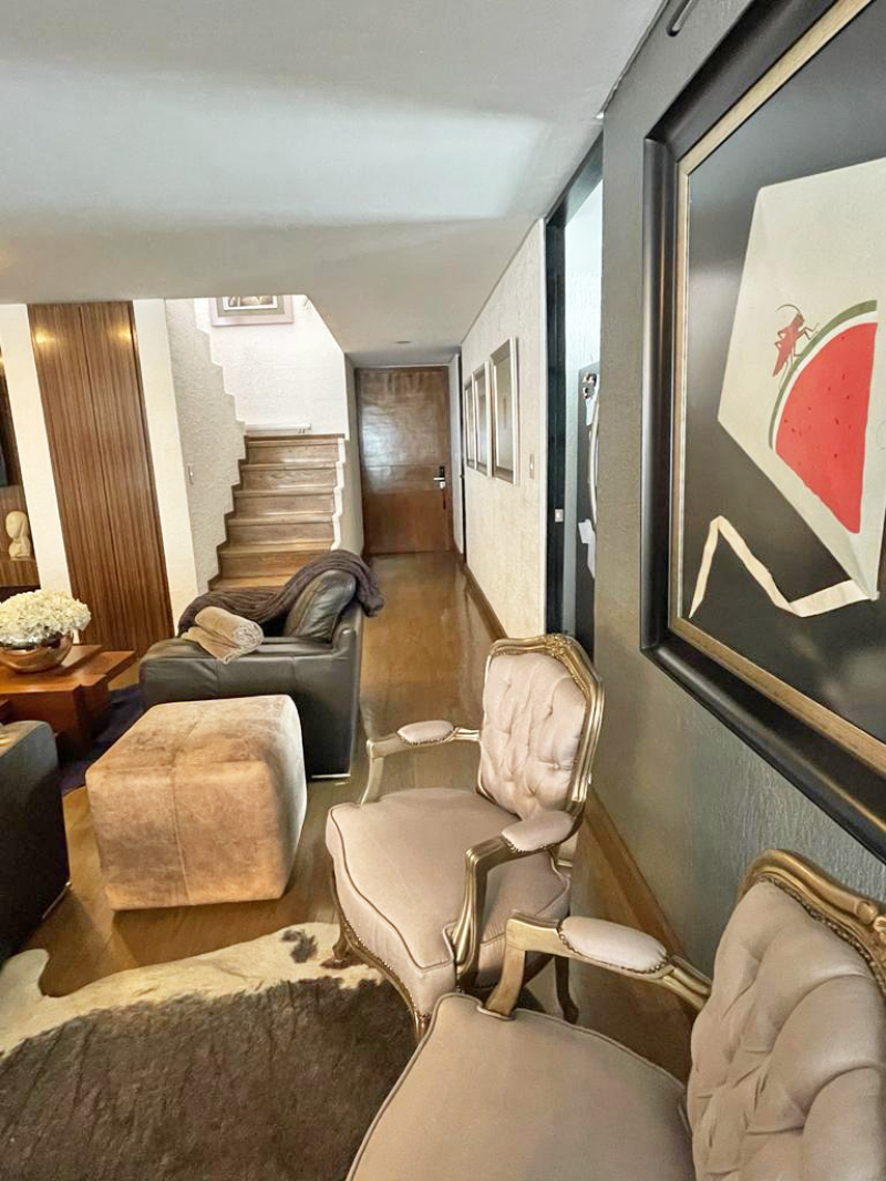 The apartment has two floors, upon entering you have a half bathroom for guests and a very large open social area, where the dining room, living room, and a TV room are located, as well as a spacious kitchen with a small breakfast area, laundry area, and service room with bathroom and three bedrooms with dressing room and private bathroom. Upstairs there is a large terrace with a very spacious room that can be the fourth bedroom or a family room, it has a full bathroom and another space that can be an office or a gym.