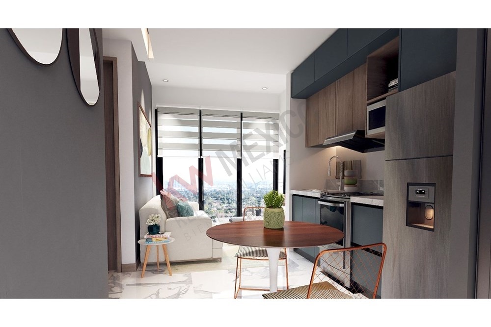 DEPARTAMENTO de 42.49 m2 de construcción, cuenta con 1 Recámara, 1 Baño completo, Cocina integral, Sala y comedor, Cuarto de lavado, 1 Cajón de estacionamiento.