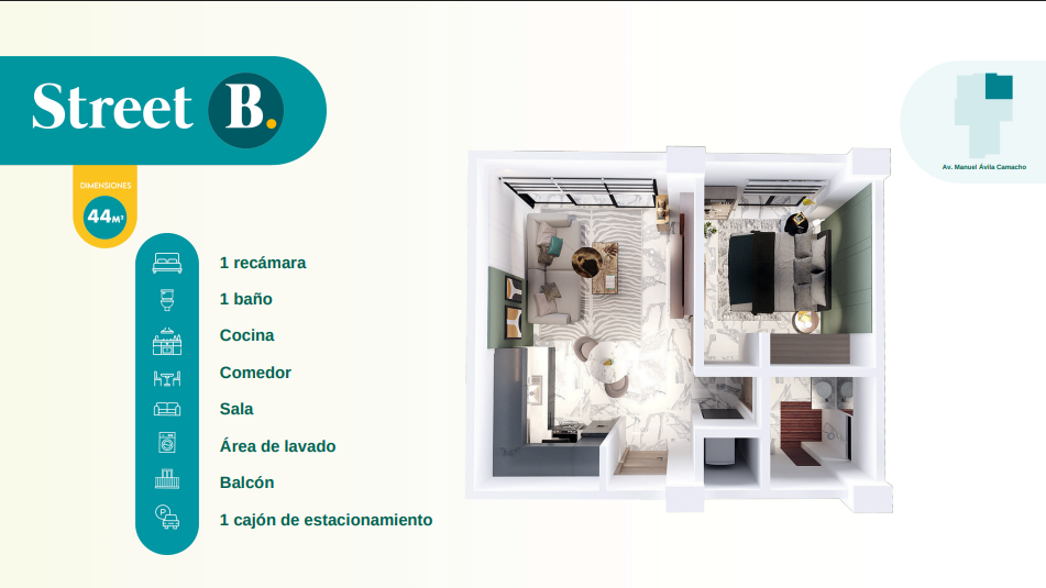 Cuenta con: 1 Recámara, 1 Baño completo, Cocina integral, Sala y comedor, Cuarto de lavado, 1 Cajón de estacionamiento, Balcón.